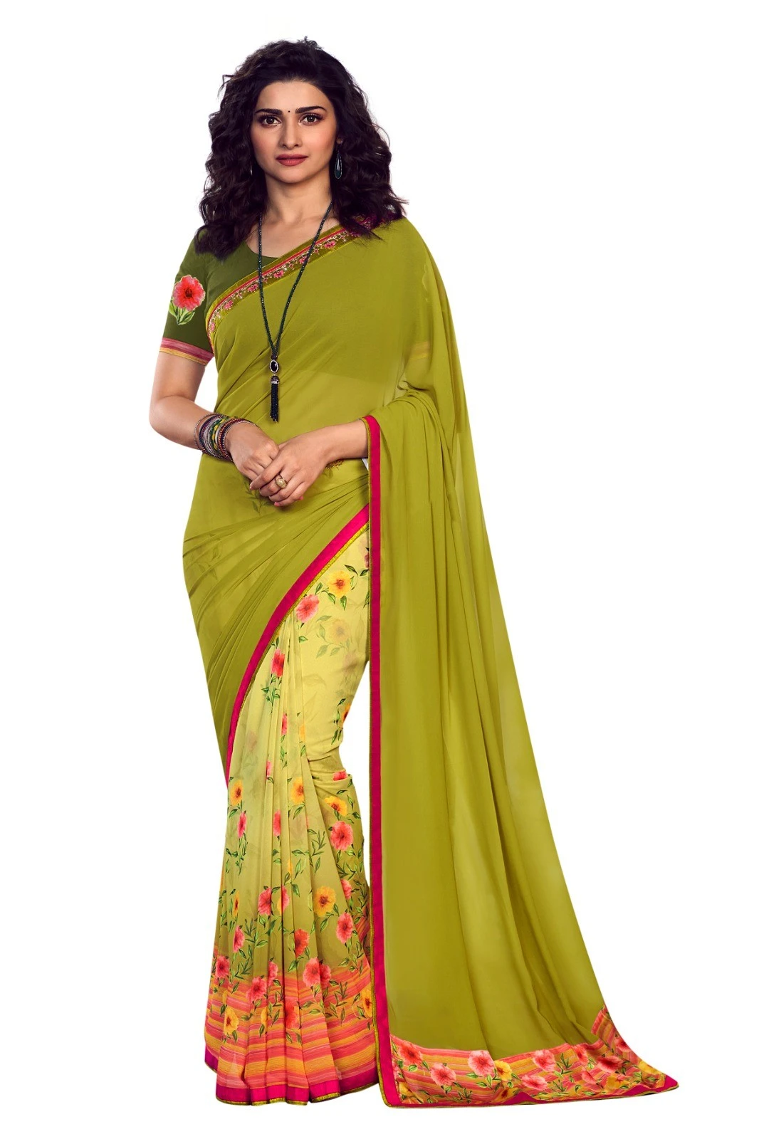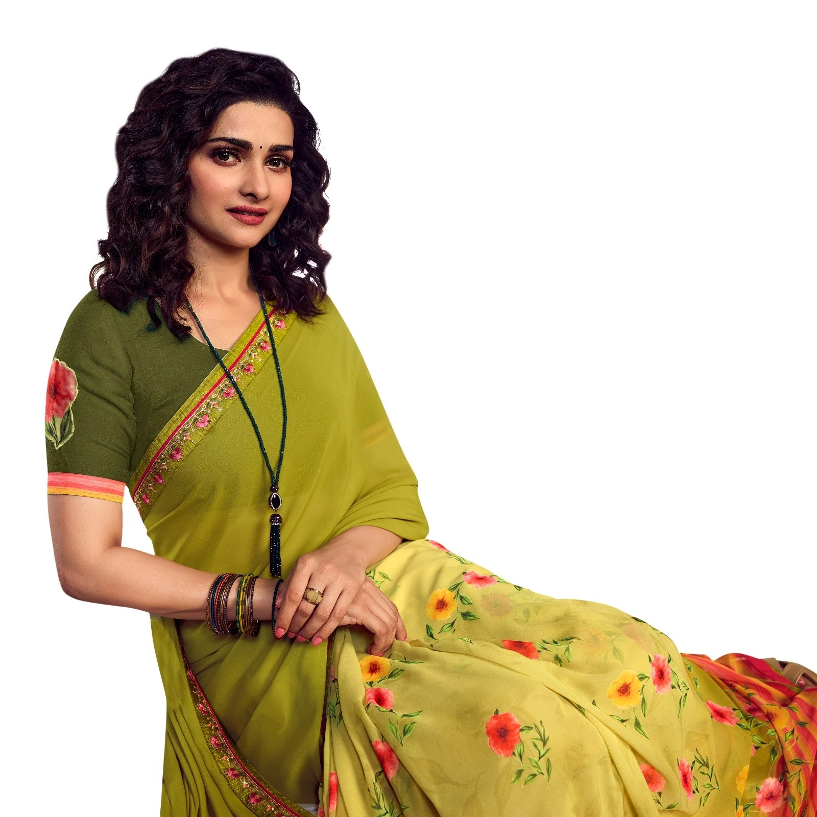 Pattern: Adorned with a captivating floral print, this saree exudes femininity and grace. The intricate floral motifs are artfully printed on the Olive Green  Georgette fabric, creating a mesmerizing visual appeal. The floral pattern adds a refreshing and vibrant touch to the saree, making it an ideal choice for various events, from casual gatherings to festive celebrations.