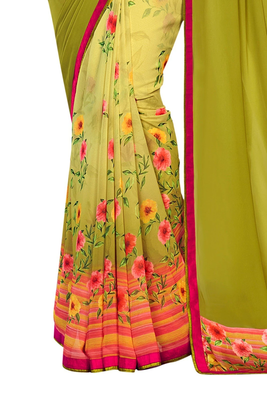 Introducing our Olive Green  Floral Printed Georgette Saree, a delightful blend of elegance and charm.