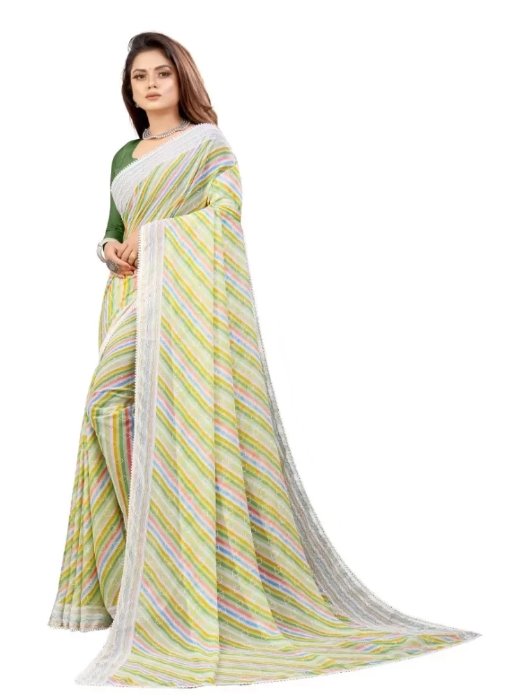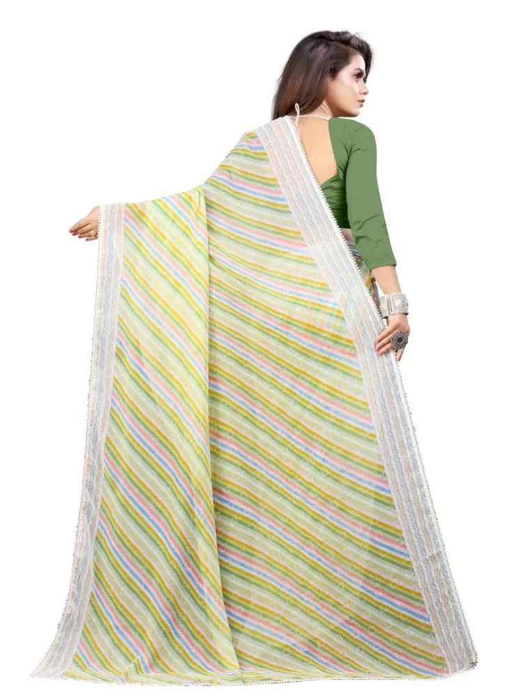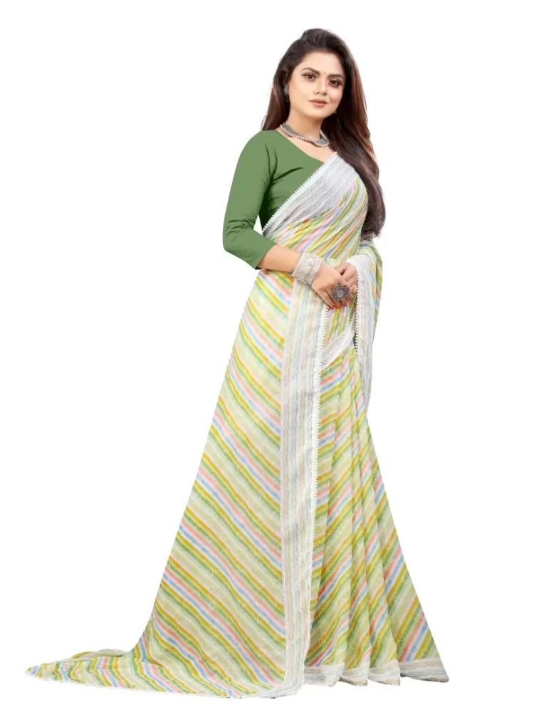 Crafted from high-quality georgette fabric, this saree offers a lightweight and breathable feel, ensuring comfort throughout the day. The subtle light green hue serves as a sophisticated canvas for the stunning Leriya print, a traditional Rajasthani pattern known for its intricate and colorful designs. The delicate prints are artfully placed to enhance the saree's overall appeal, making it a versatile choice for both casual and formal occasions.