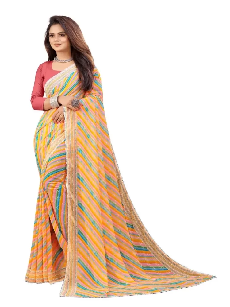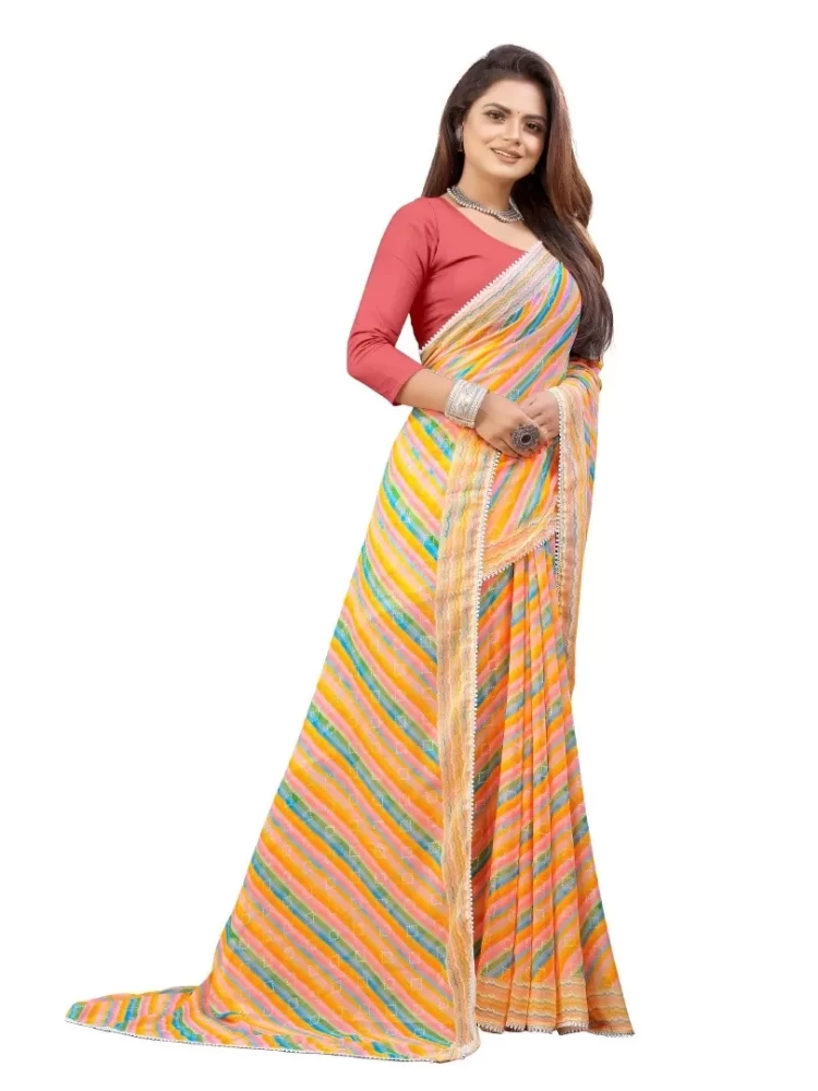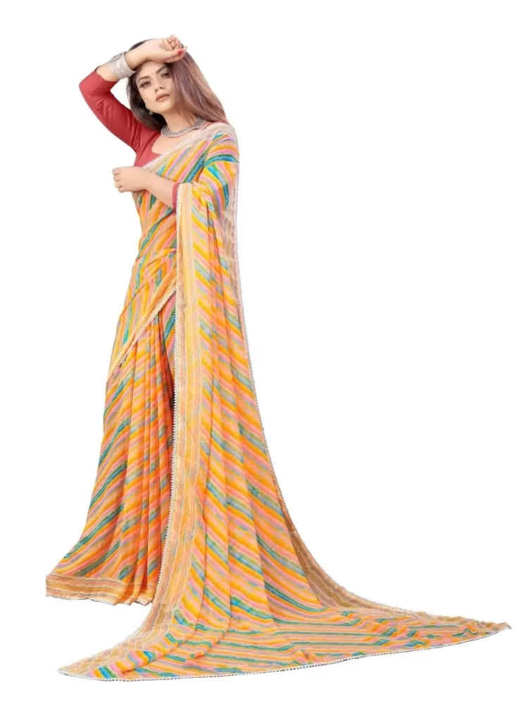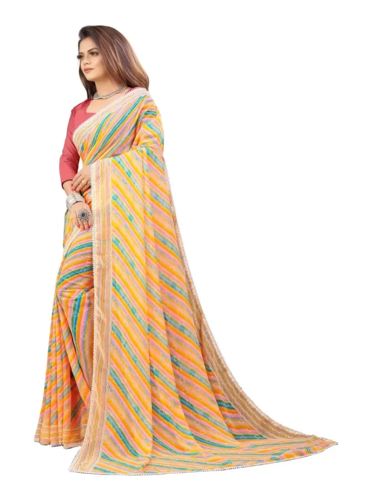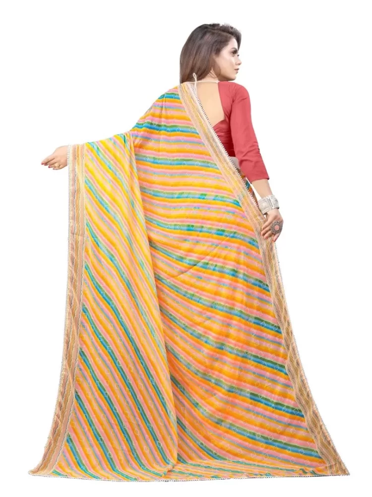 Crafted from high-quality georgette fabric, this saree offers a lightweight and breathable feel, ensuring comfort throughout the day. The subtle yellow hue serves as a sophisticated canvas for the stunning Leriya print, a traditional Rajasthani pattern known for its intricate and colorful designs. The delicate prints are artfully placed to enhance the saree's overall appeal, making it a versatile choice for both casual and formal occasions.Pair this elegant saree with a matching blouse and statement jewelry to complete your ensemble. The saree comes with an attached blouse piece, giving you the freedom to tailor it to your desired fit and style.