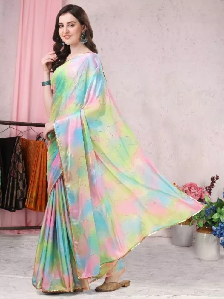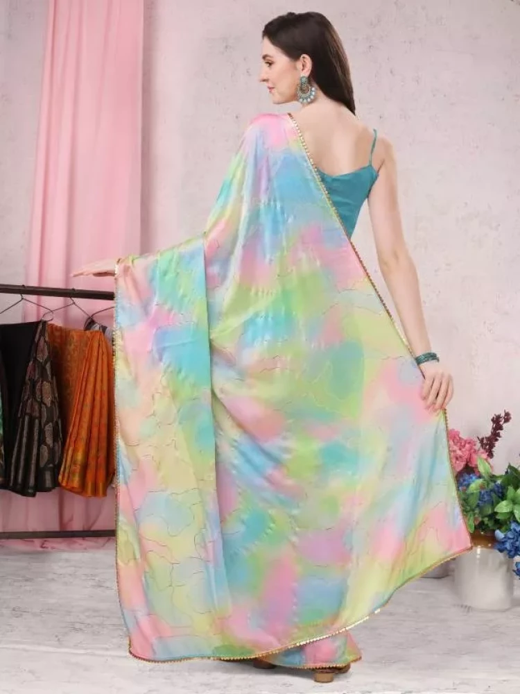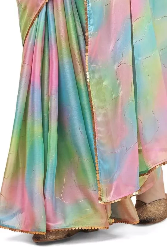 Whether you're attending a wedding, a festive celebration, or a social gathering, this saree is the perfect choice for making a memorable impression. Its vibrant color combination, intricate foil print detailing, and luxurious fabric make it suitable for a variety of occasions. Pair it with statement jewelry and accessories to complete your look with finesse.