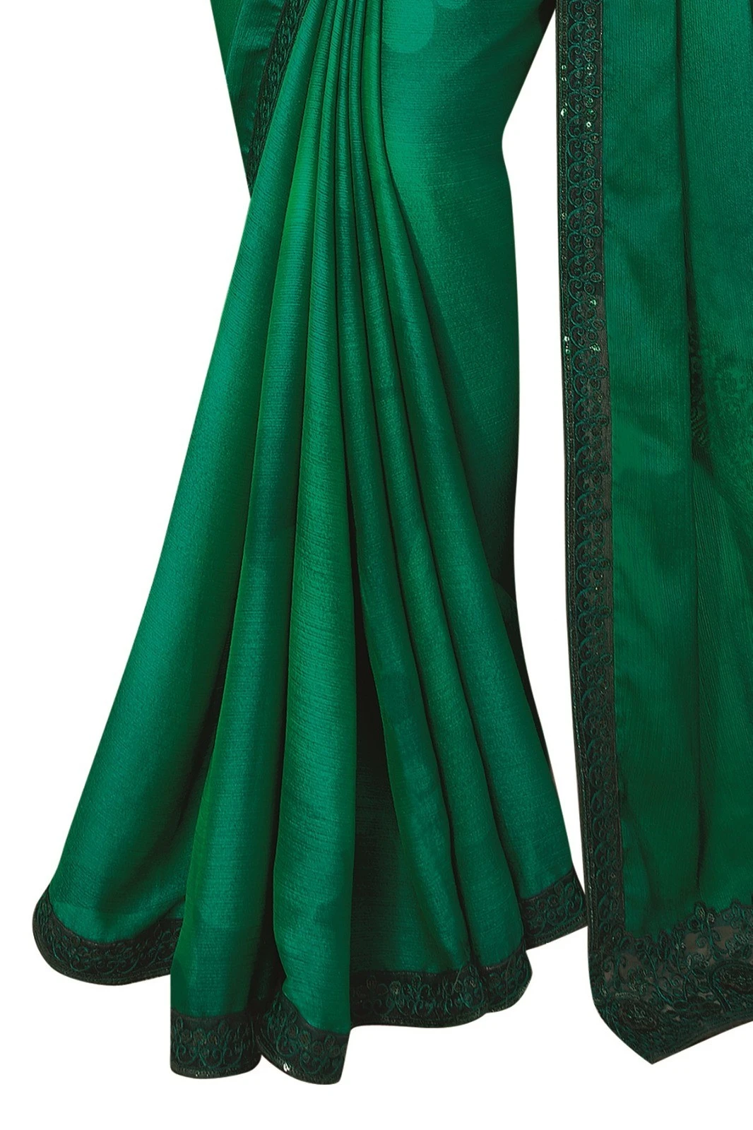 Fabric: Crafted from high-quality Vichitra fabric, this saree boasts a luxurious texture and a rich, vibrant color. The dark green hue exudes elegance and adds a touch of glamour to your ensemble. Vichitra fabric is known for its softness and drape, ensuring comfort and ease of movement throughout the day or night.