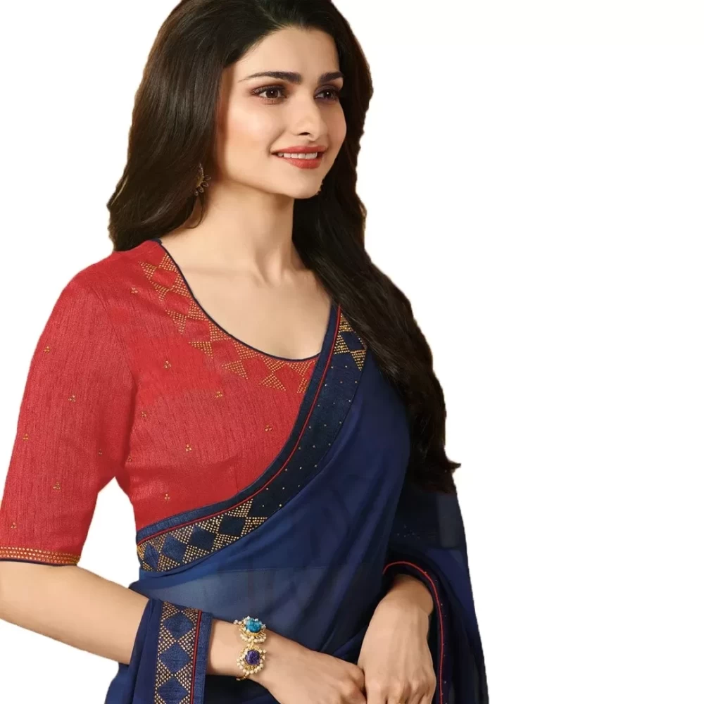This exquisite saree is crafted from high-quality georgette fabric, known for its lightweight and flowing drape, ensuring both comfort and elegance. The rich Navy Blue of the saree is beautifully complemented by intricate stone work, adding a touch of sparkle and sophistication to your ensemble.