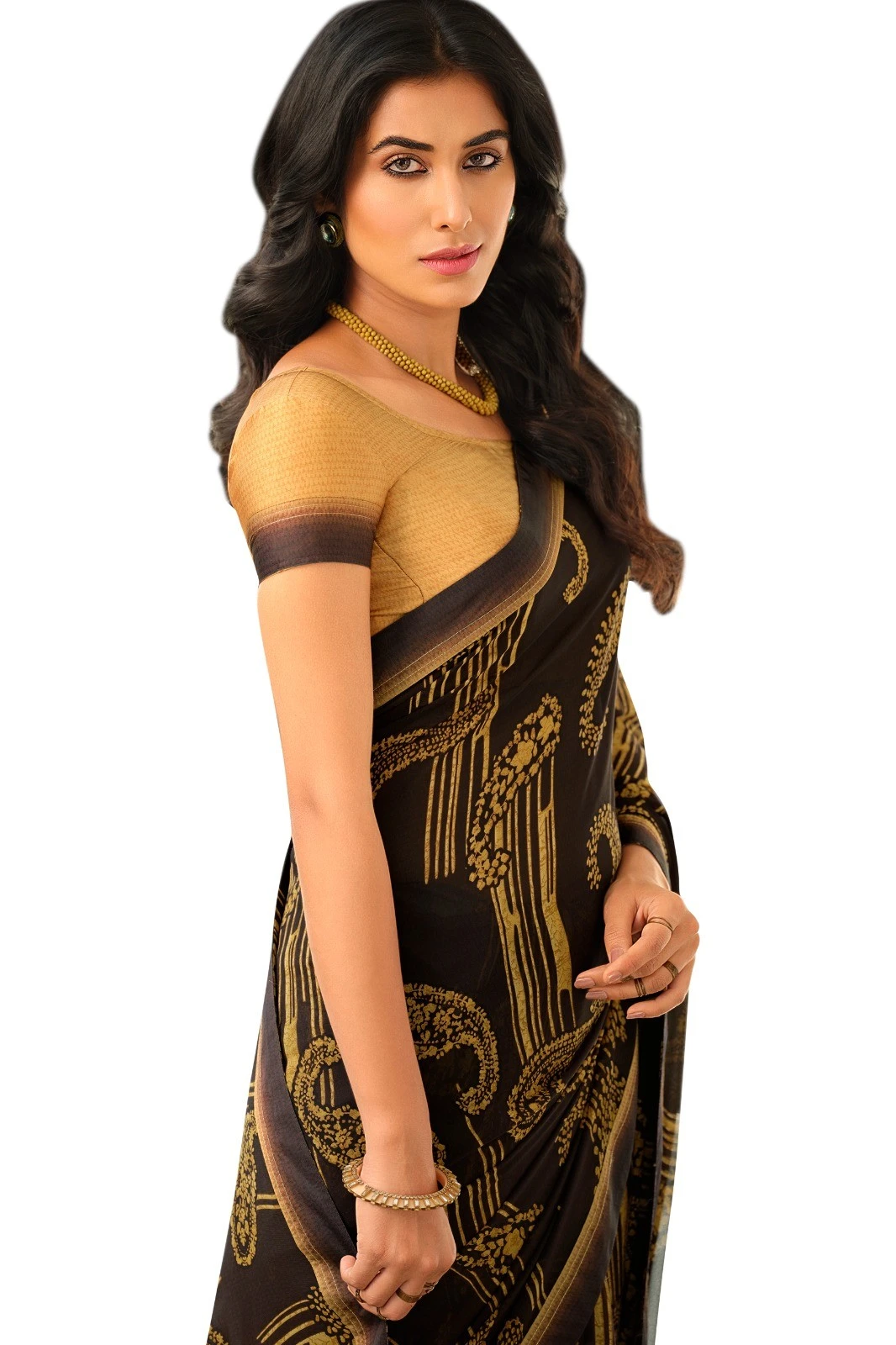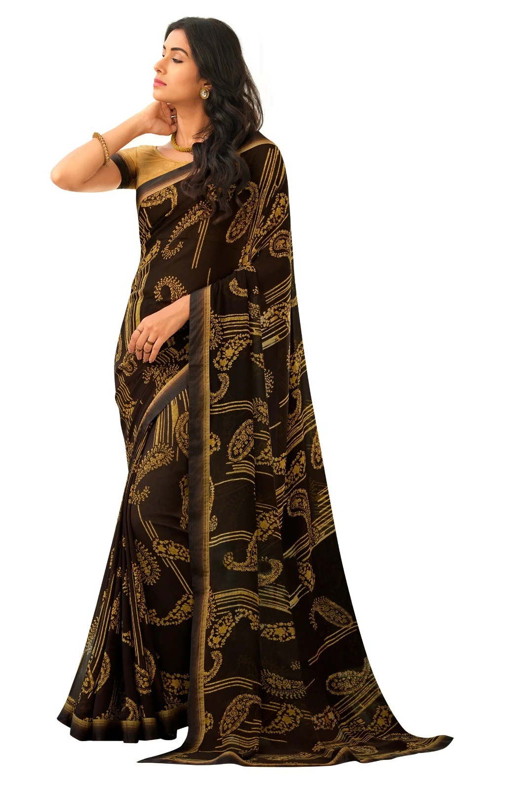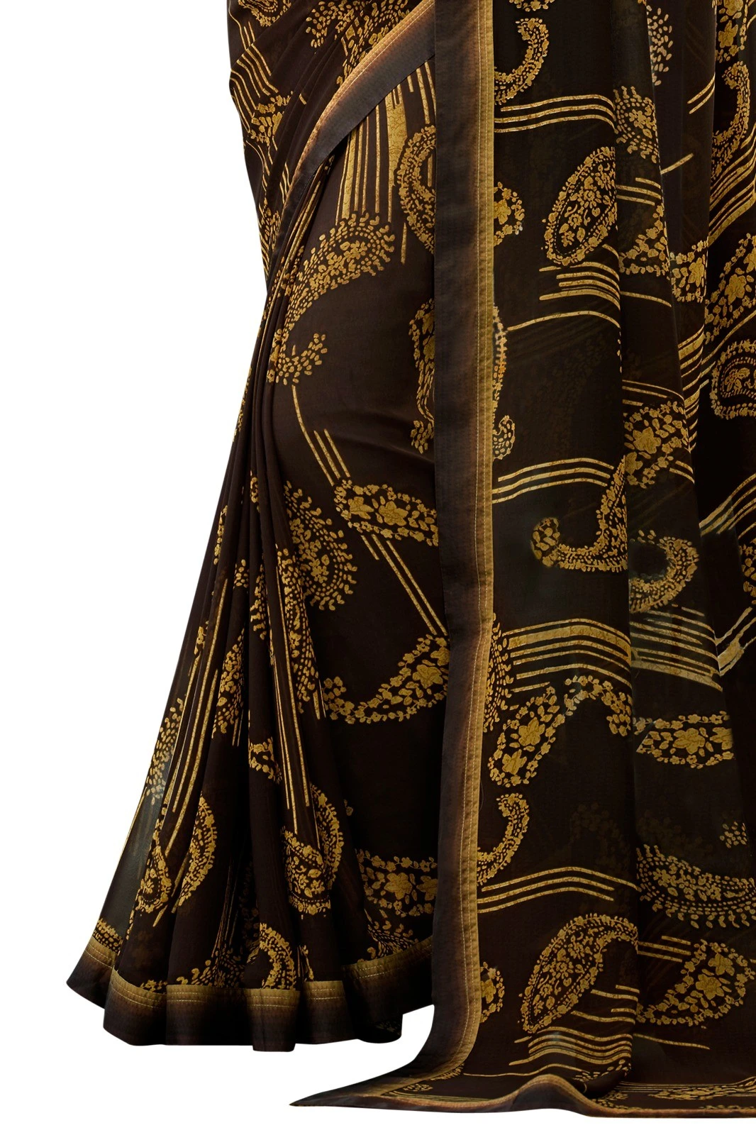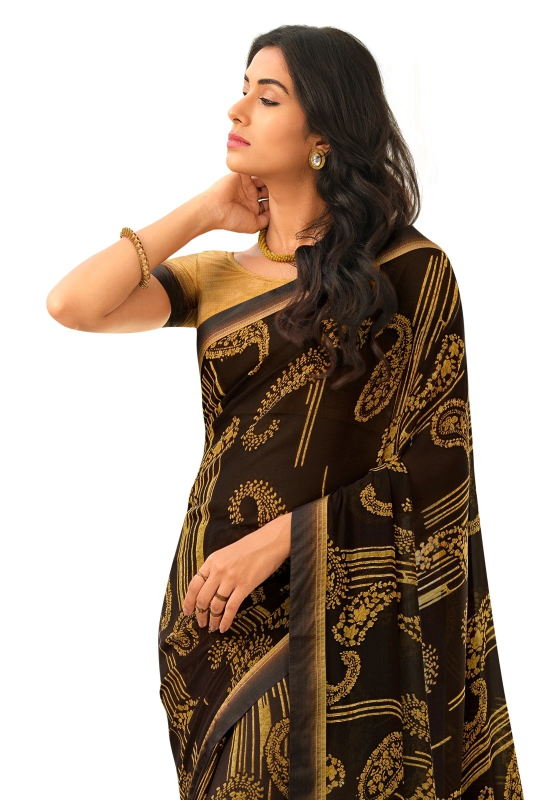 Pattern: Adorned with a chic and trendy print, this saree exudes modernity and style. The intricate patterns and motifs are artfully printed on the Brown Georgette fabric, creating a striking contrast and visual interest. The contemporary print adds a touch of flair to the traditional silhouette, making it perfect for fashion-forward individuals looking to make a statement.