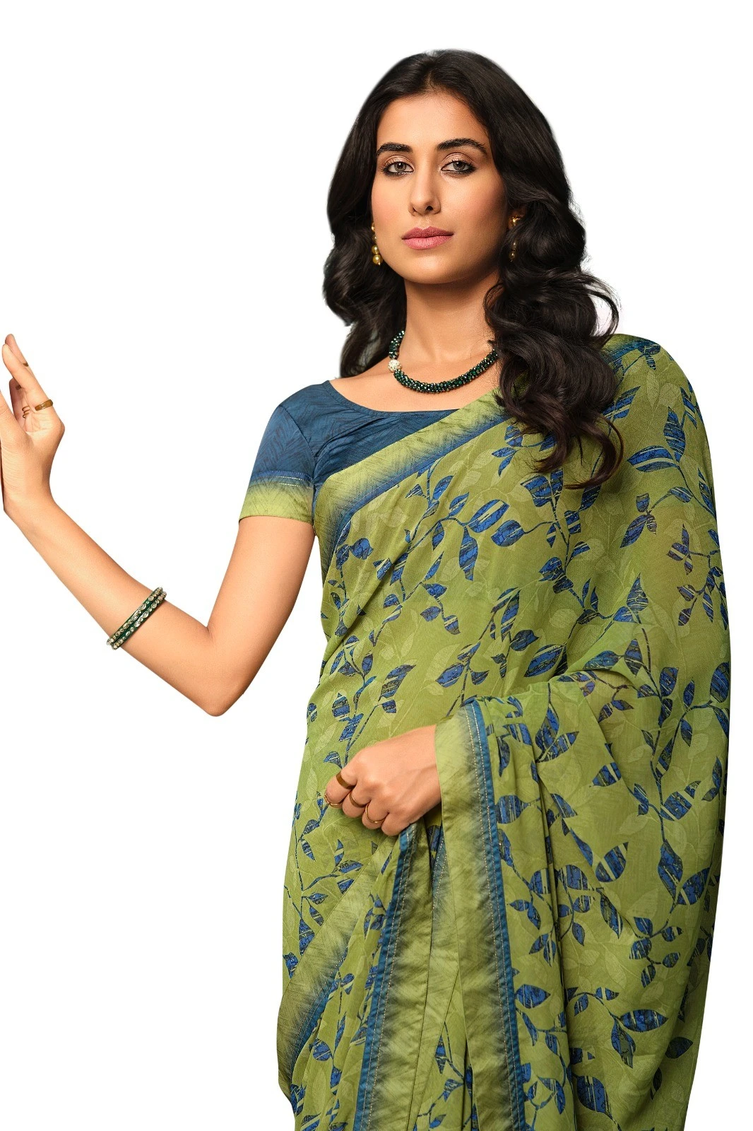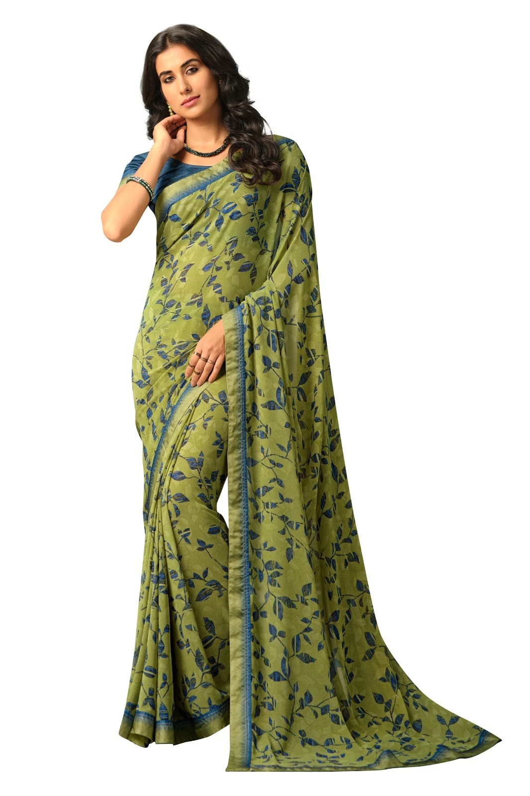 Pattern: Adorned with a chic and trendy print, this saree exudes modernity and style. The intricate patterns and motifs are artfully printed on the MEHENDI Georgette fabric, creating a striking contrast and visual interest. The contemporary print adds a touch of flair to the traditional silhouette, making it perfect for fashion-forward individuals looking to make a statement.