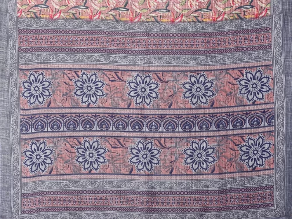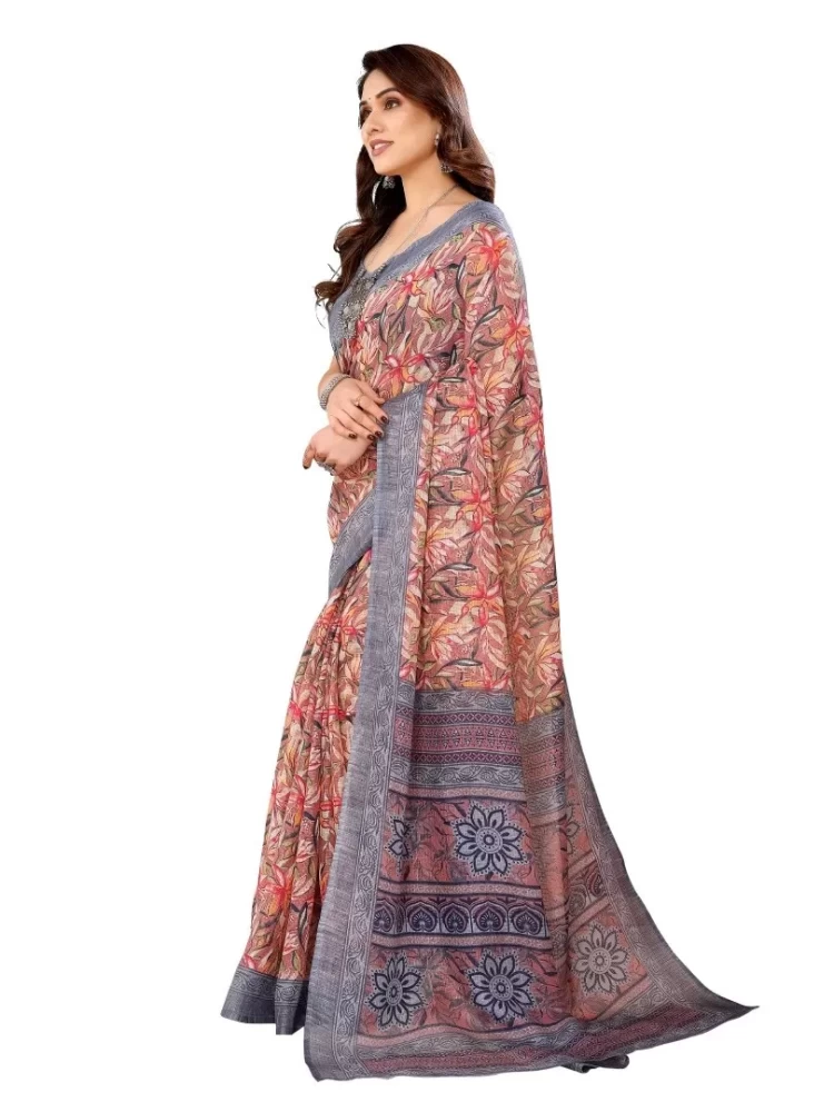 The rich grey color adds a touch of sophistication, while the intricate printed design enhances its overall appeal. The delicate patterns are inspired by traditional motifs, adding a cultural and artistic flair to the saree.