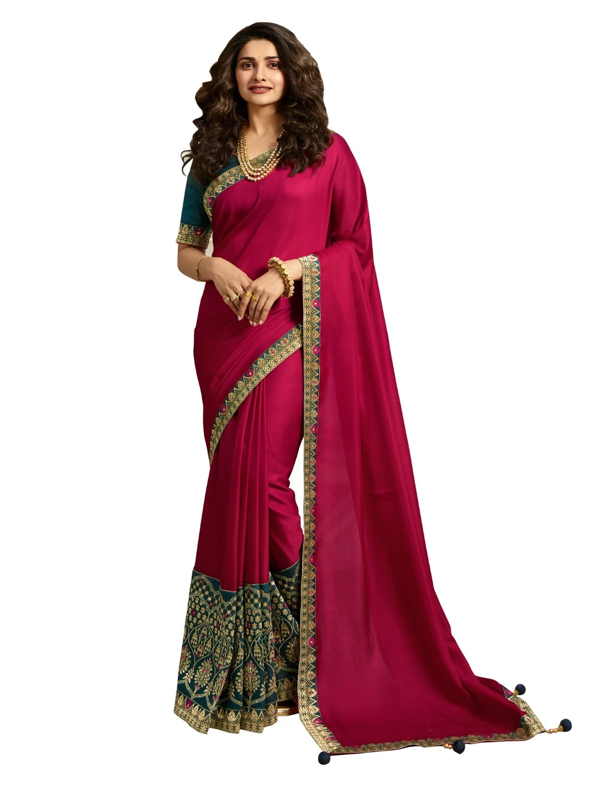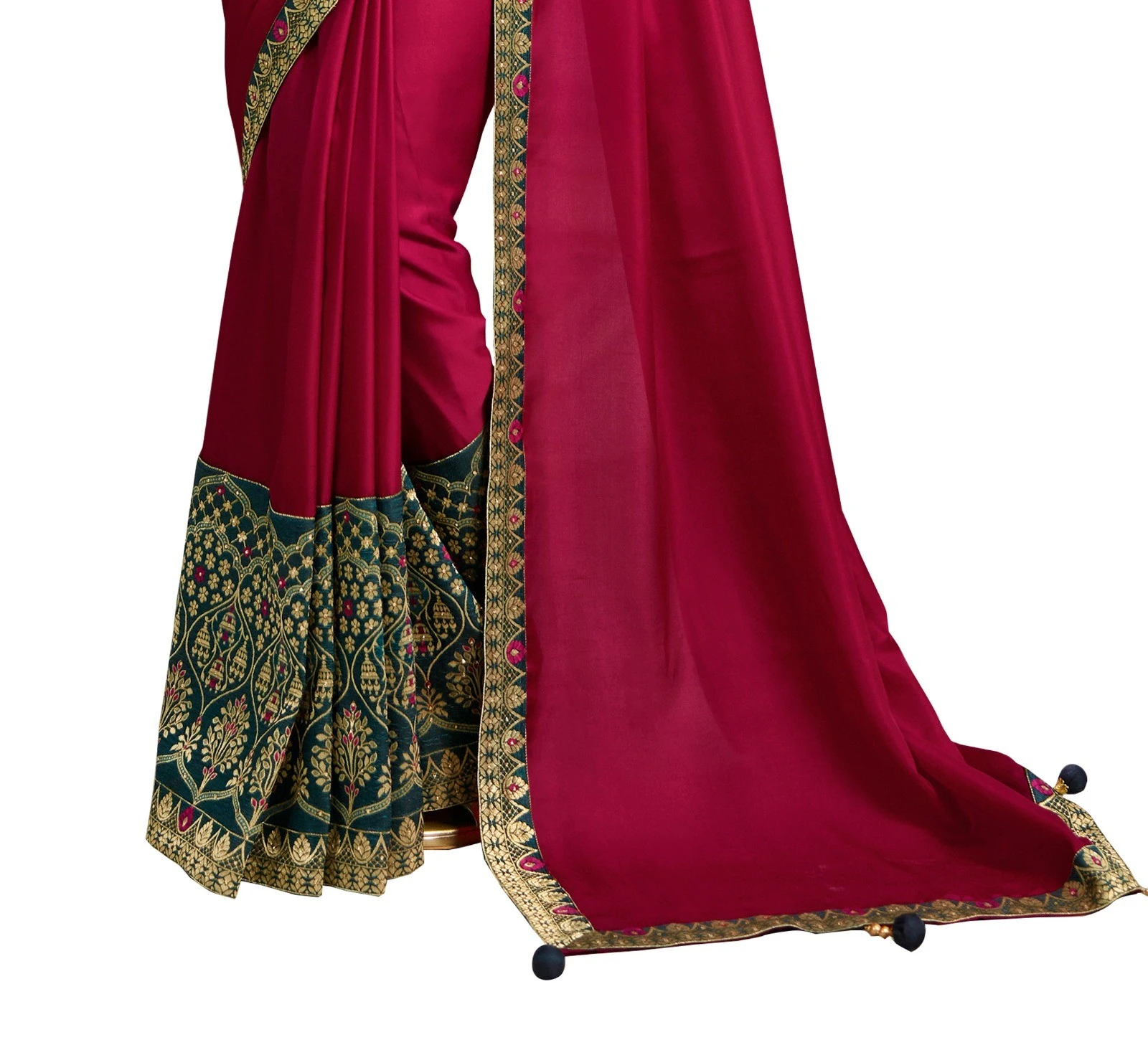 Vichitra Fabric Plain Red Saree With Jaquard Border and Blouse