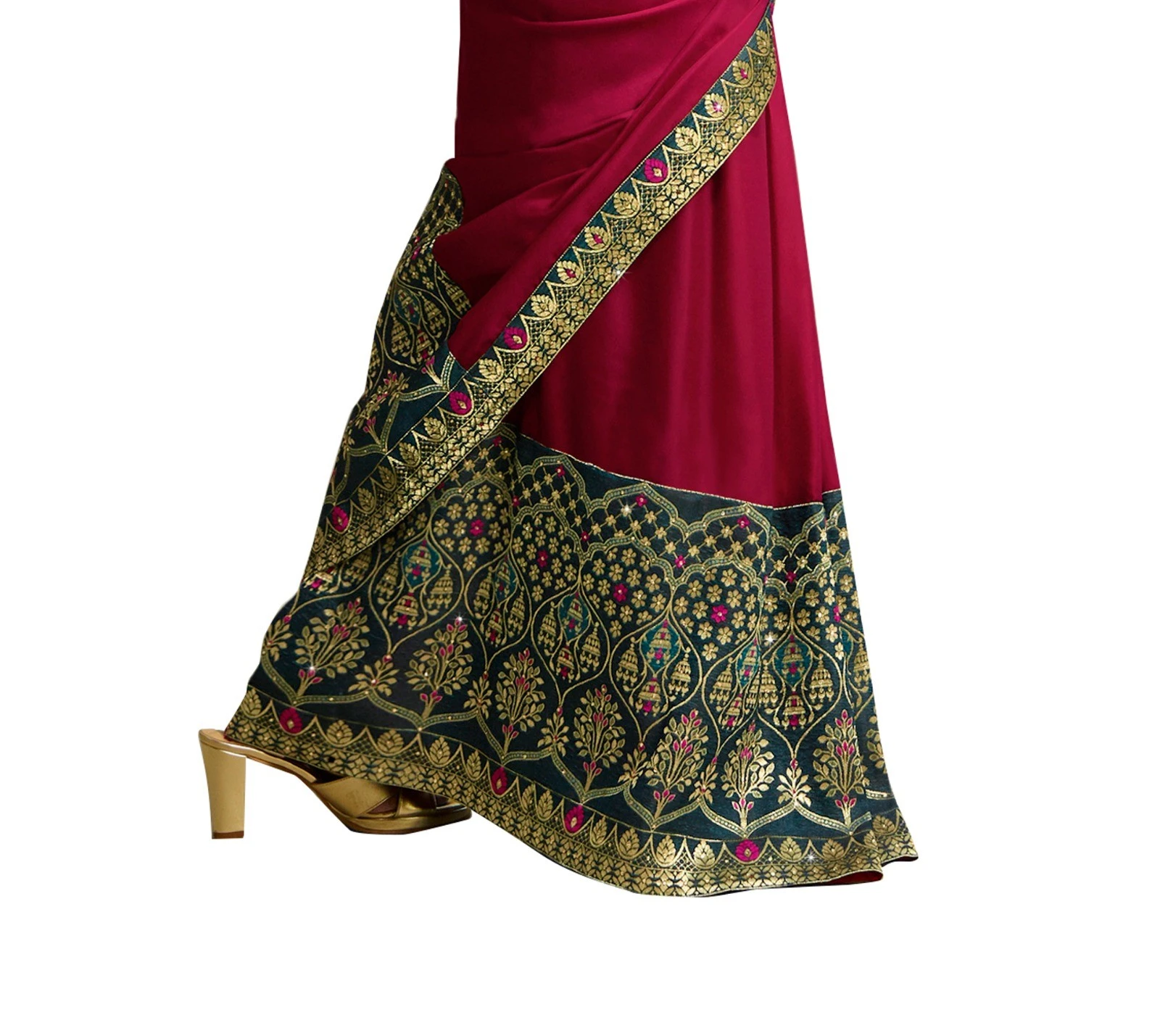 Fabric: Crafted from premium Vichitra fabric, this saree boasts a smooth texture and luxurious feel, ensuring comfort and elegance with every drape. The Vichitra fabric adds a subtle sheen to the saree, elevating its appeal and making it perfect for various occasions.