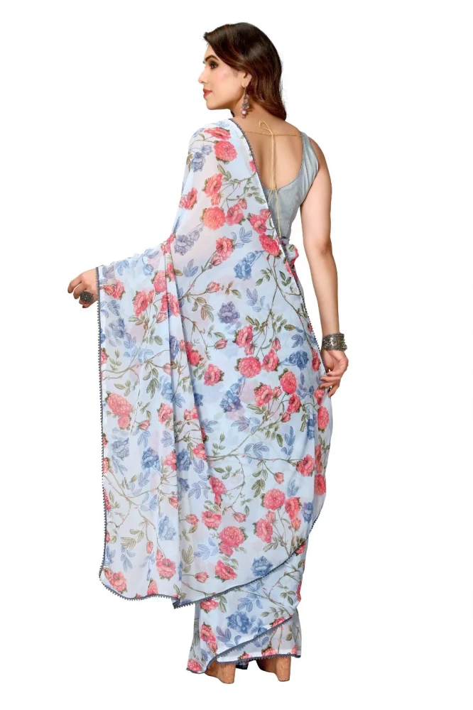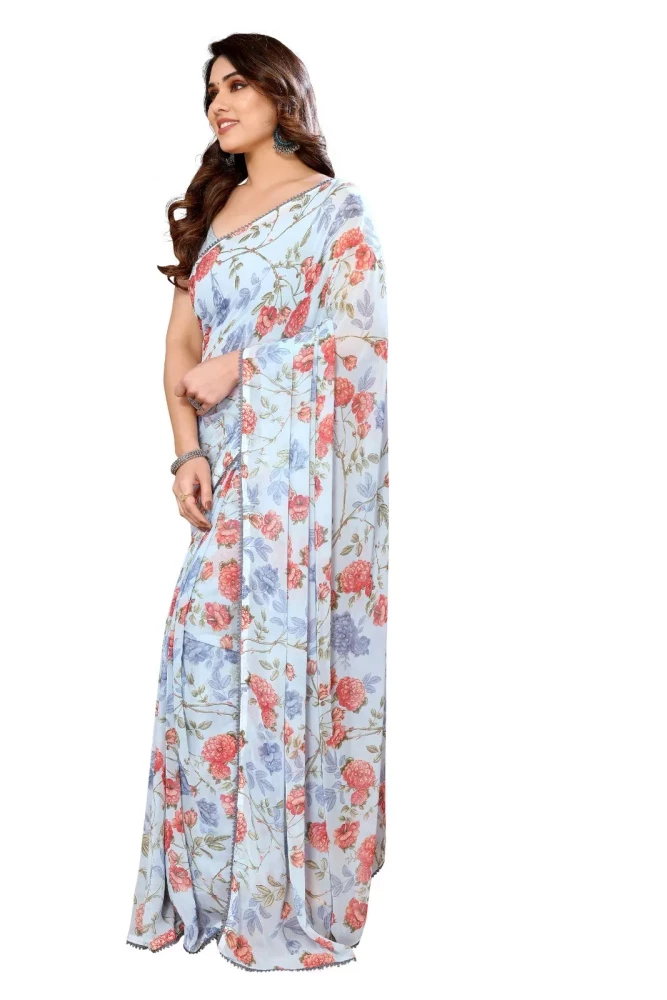 Women Light Blue Printed Redy to Wear Saree With Lace Border