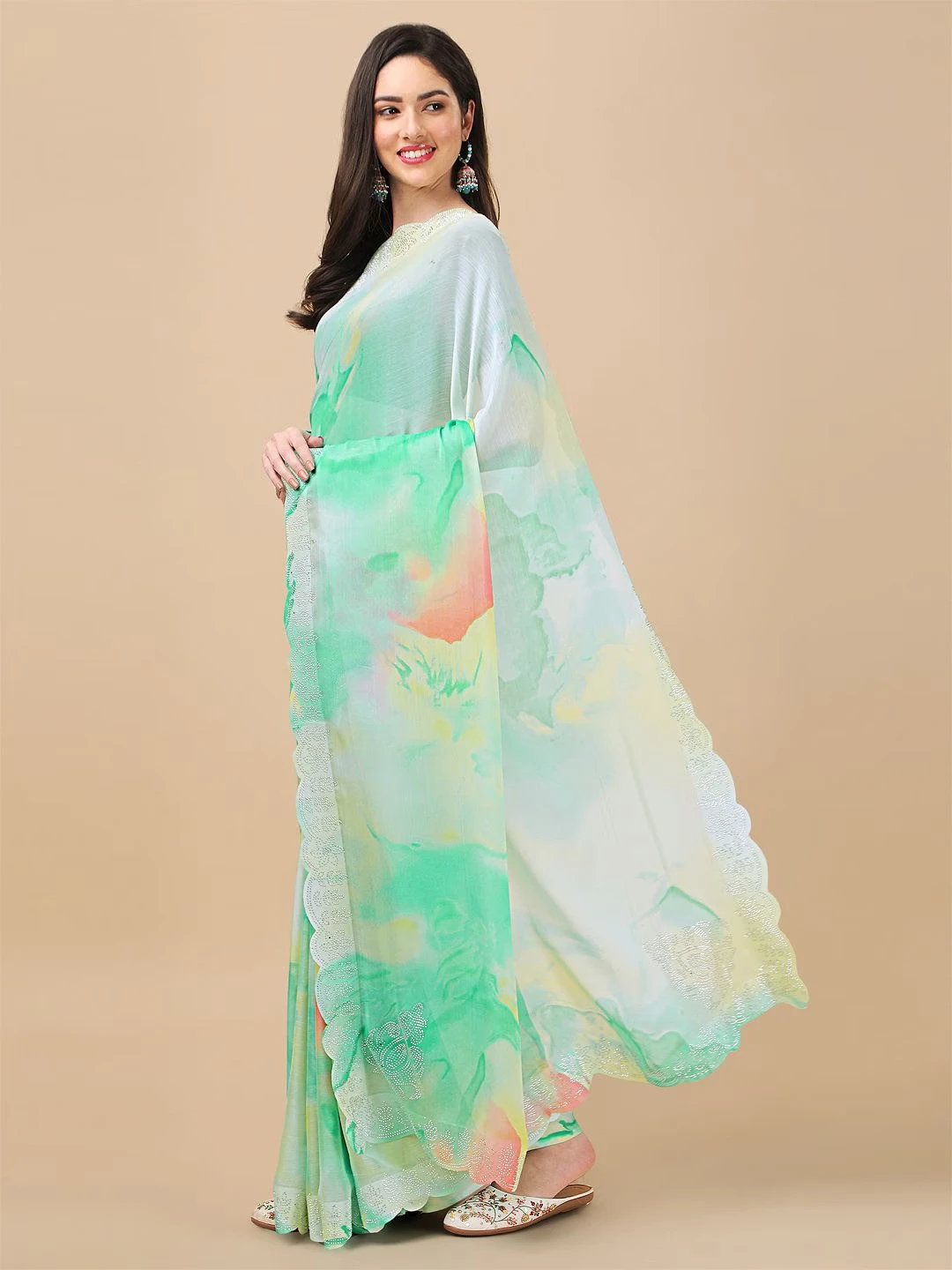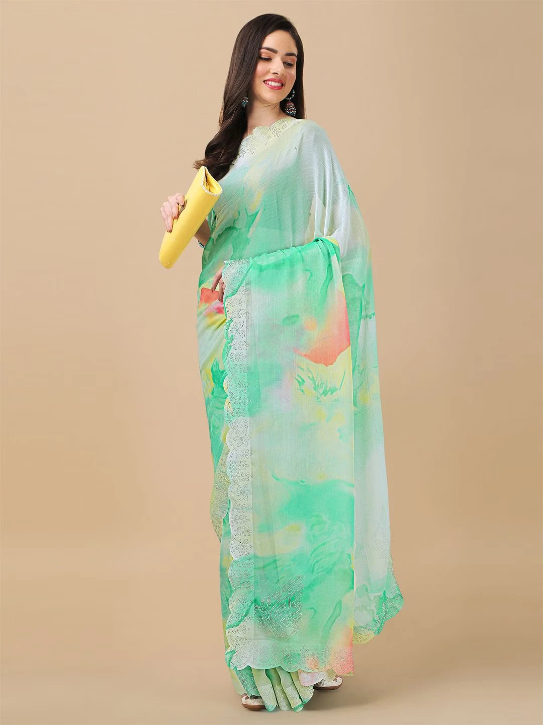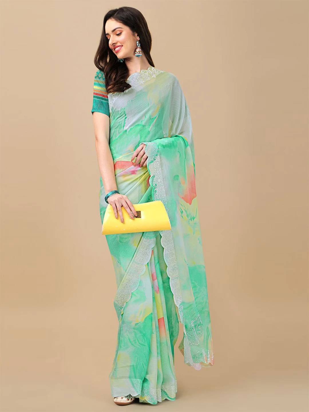 Women Light Green Printed Chiffon Saree with STONE WORK