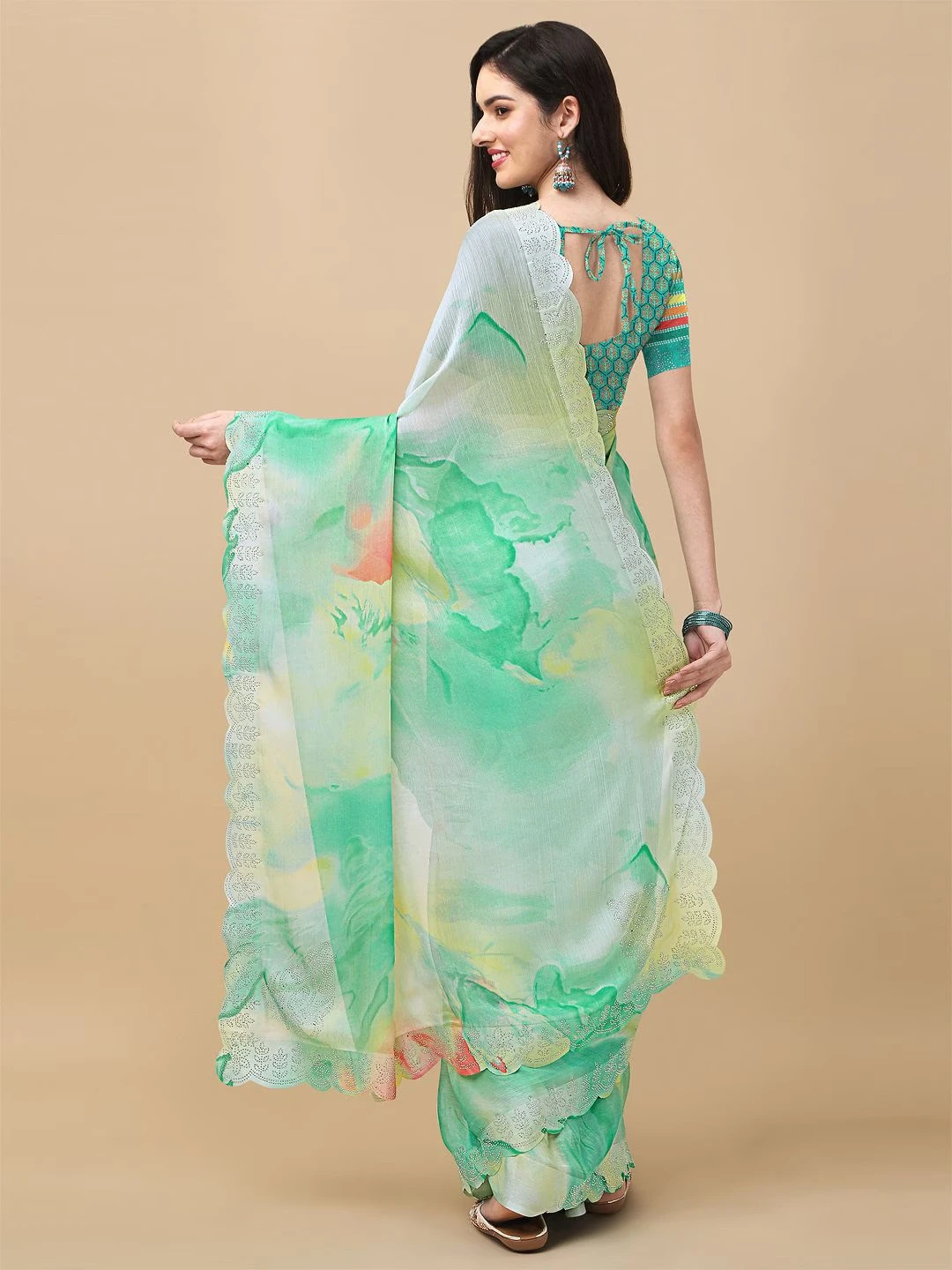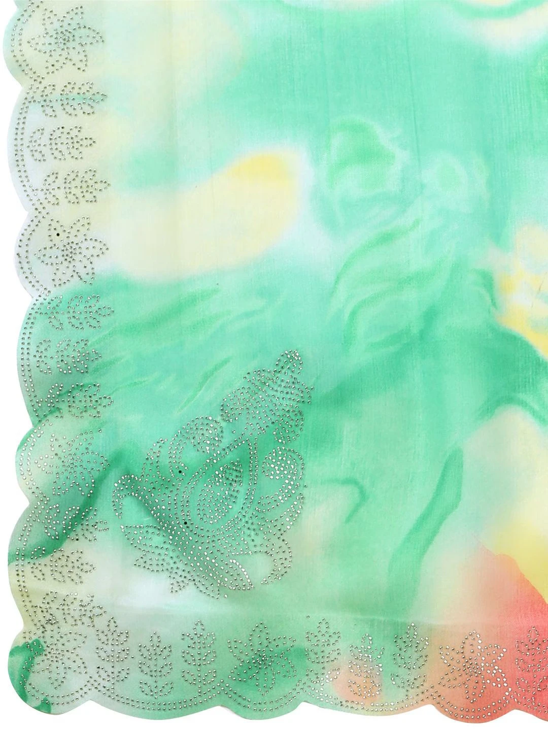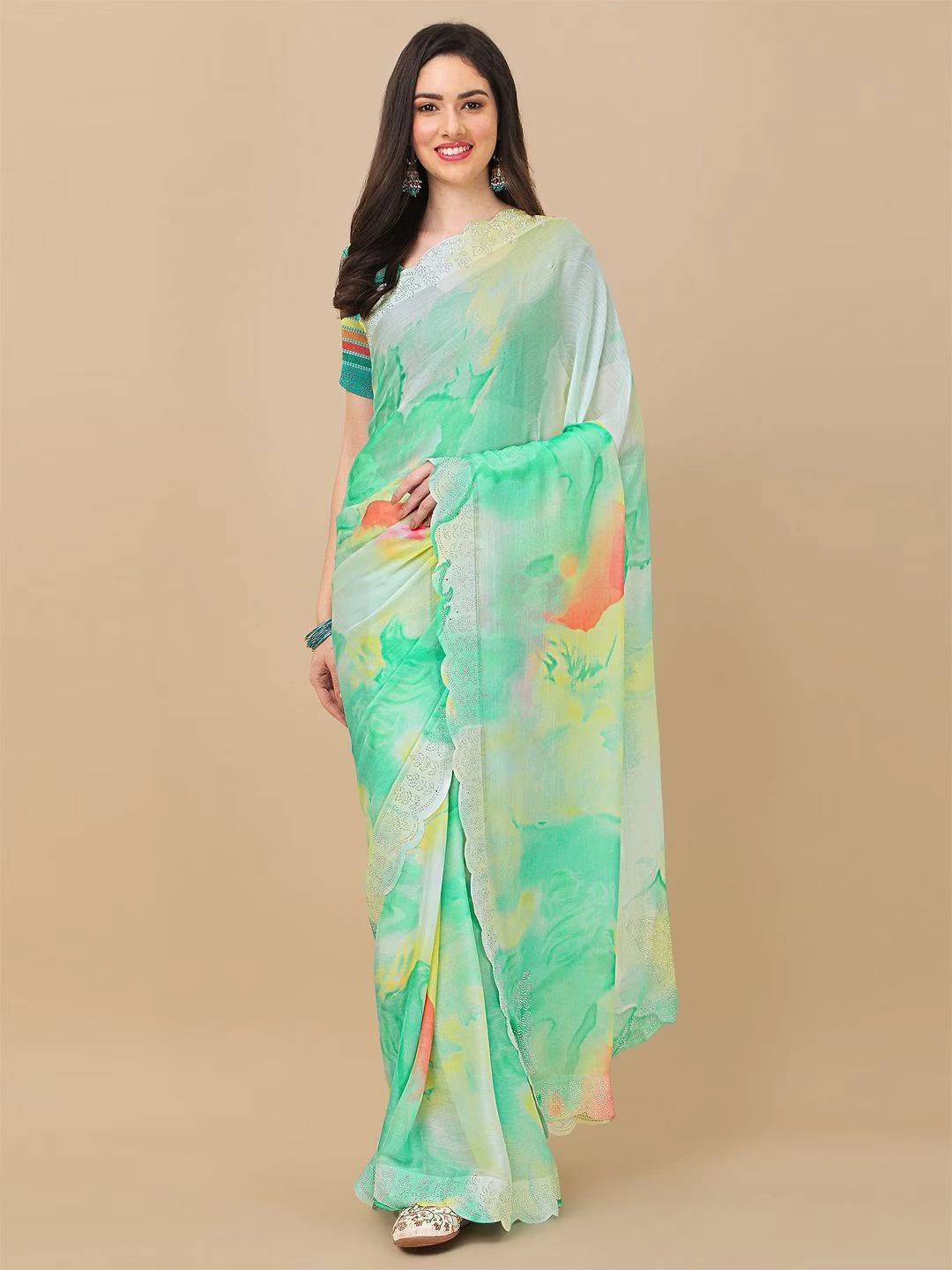 Women Light Green Printed Chiffon Saree with STONE WORK