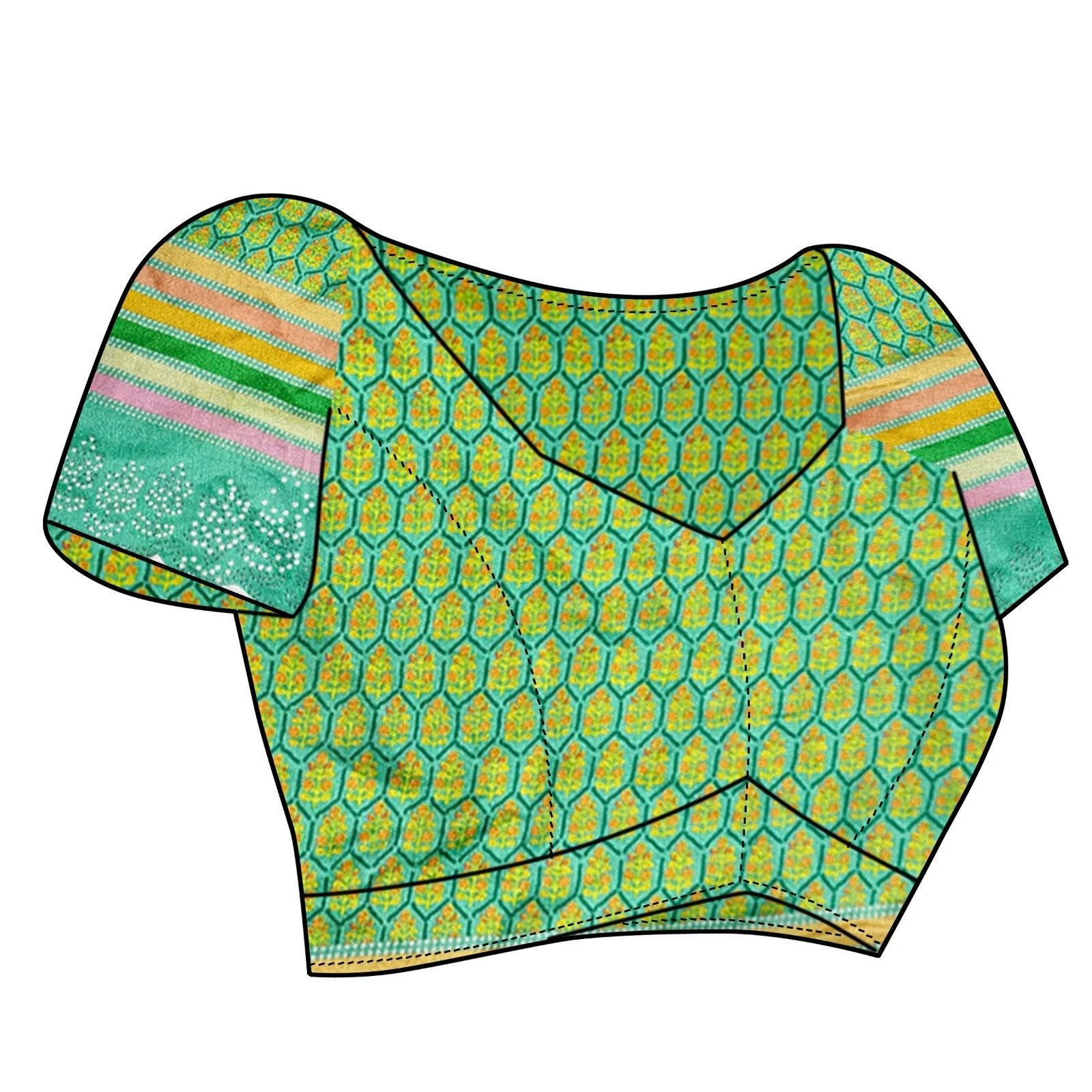 2. Design: Adorned with captivating prints and intricate stone work, this saree is a visual delight. The light green hue complements a range of skin tones, while the printed design adds depth and dimension to the ensemble. The meticulous stone work enhances the saree's appeal, adding a hint of sparkle and glamour. Whether you're attending a wedding, festive celebration, or social gathering, this saree is sure to make you stand out.
