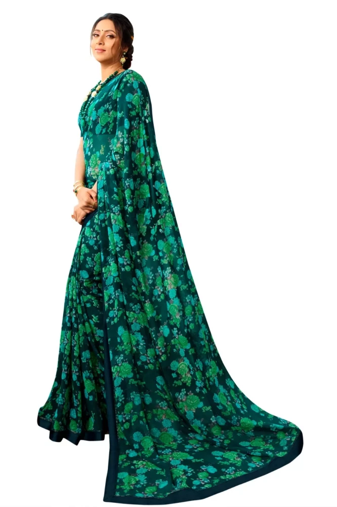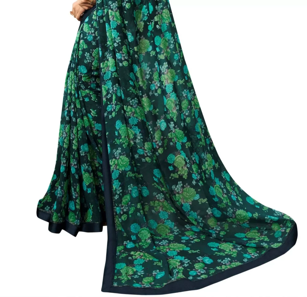 The saree features a mesmerizing blue flower print that exudes grace and sophistication. Crafted from premium georgette fabric, the saree drapes beautifully and accentuates your silhouette with its fluid movement. The lightweight and breathable fabric ensure maximum comfort, allowing you to move with ease and confidence throughout the day.