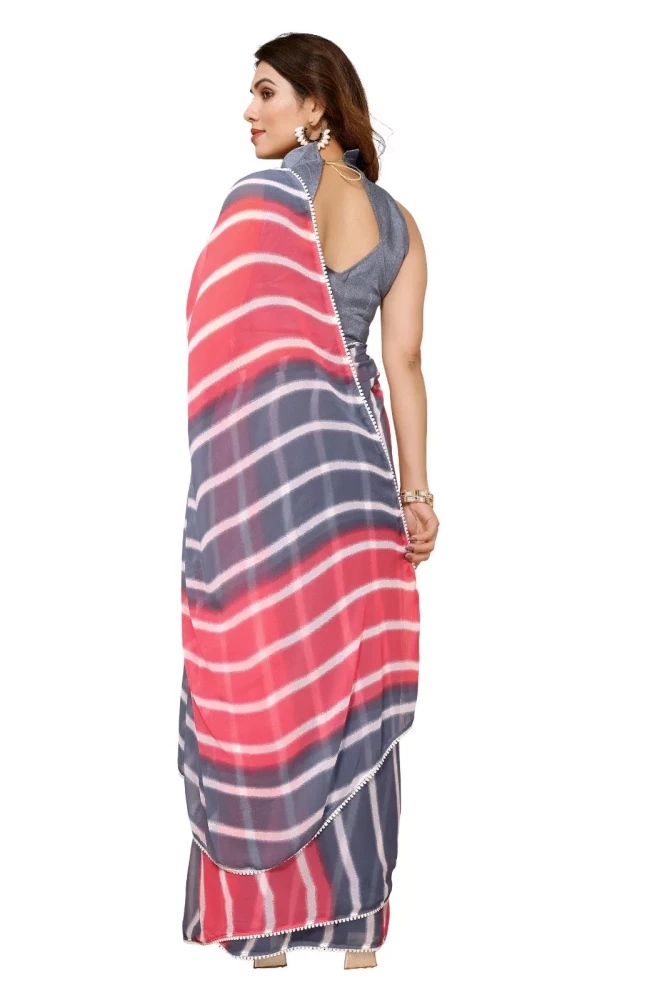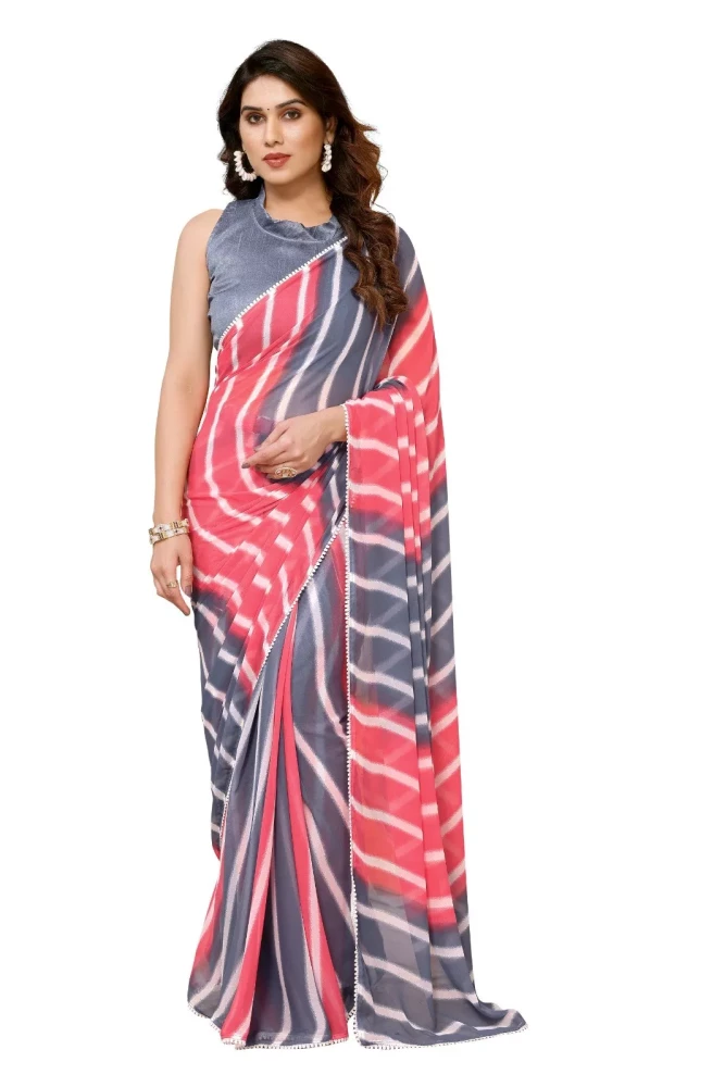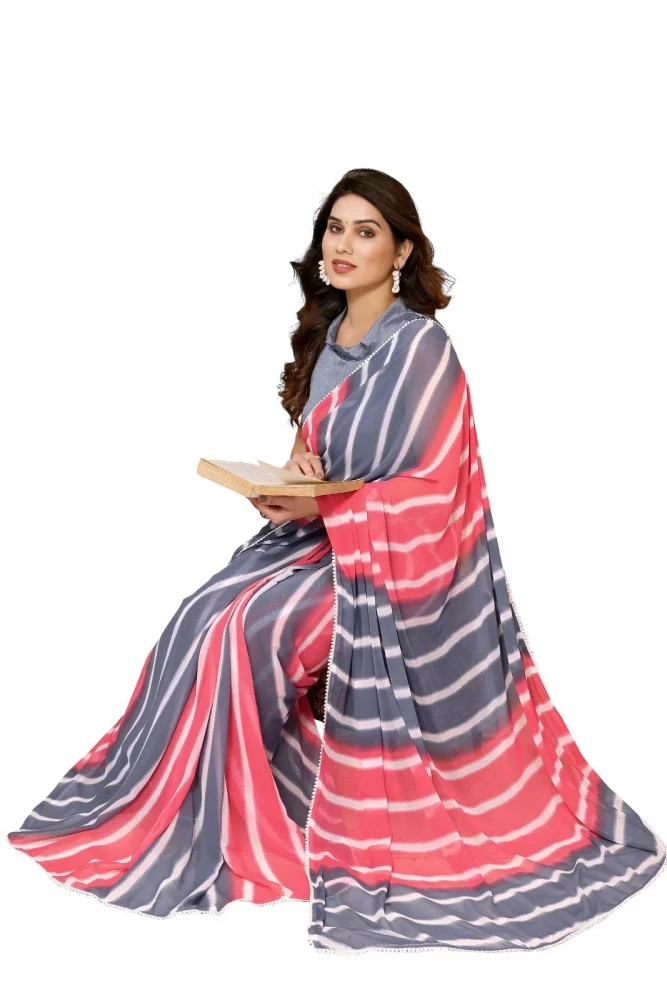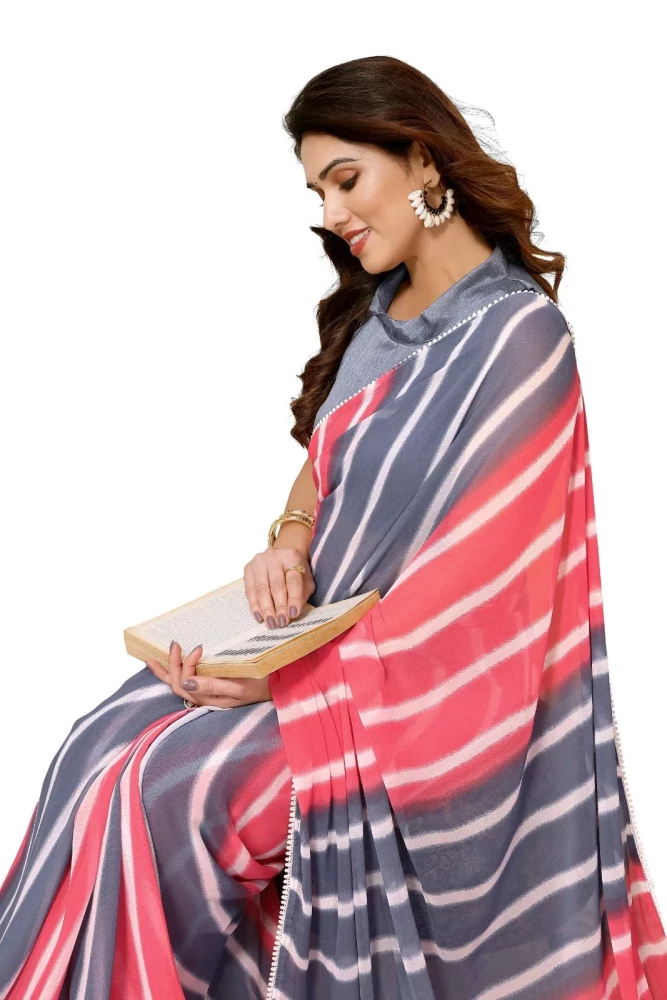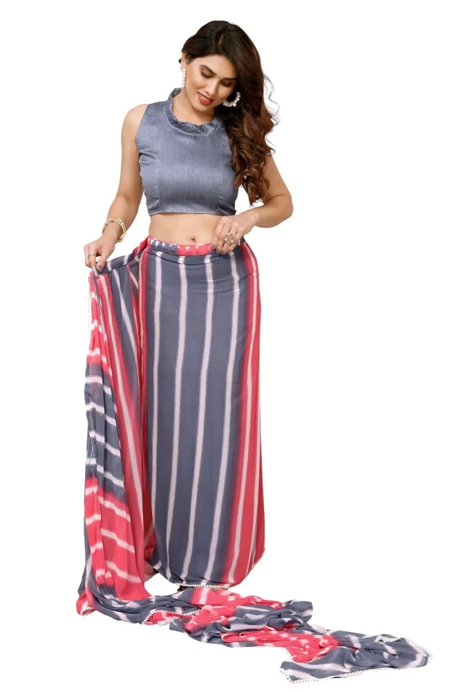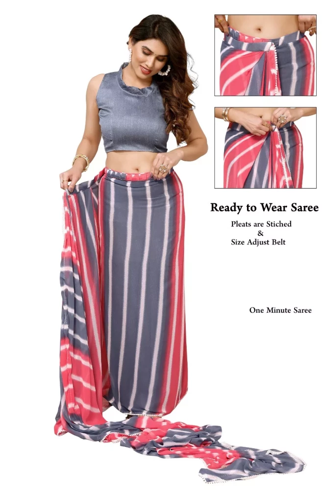 Women Redy to Wear Printed Grey and Pink Saree With Small Lace Border Blouse