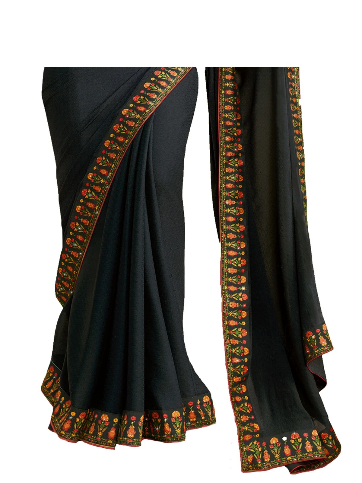 Fabric: Crafted from premium SANGINI fabric, this saree epitomizes luxury and sophistication. The SANGINI fabric offers a smooth and lustrous texture, ensuring comfort and grace with every drape. Its lightweight nature makes it perfect for long hours of wear, while its rich black hue adds a touch of glamour to your ensemble.