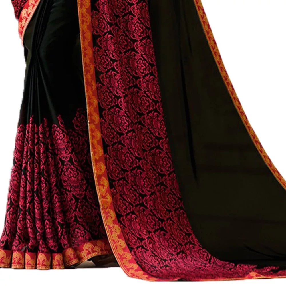 Womens Printed Georgette Black Red Sarees with plain blouse