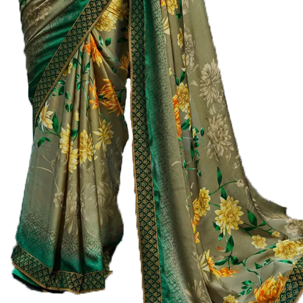 Womens Silk Georgette Printed Green Saree With Jacquard Work Lace Border