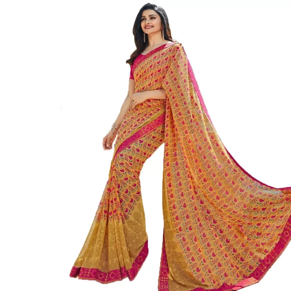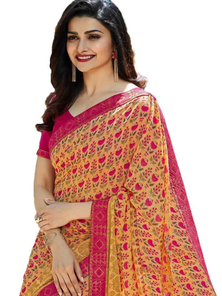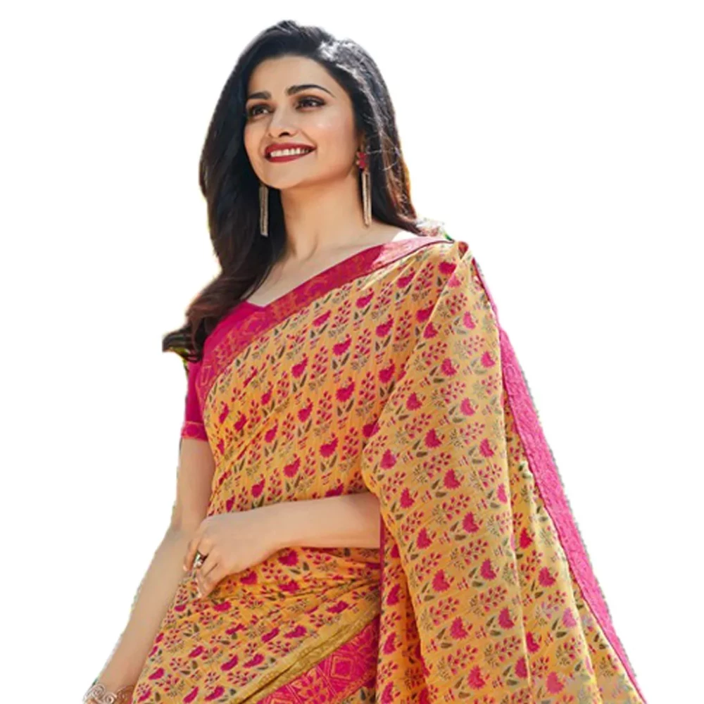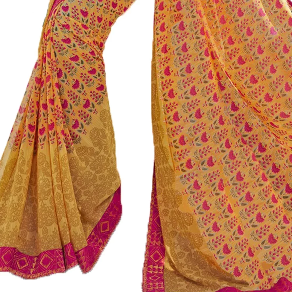 Womens Silk Georgette Printed Pink Yellow Saree With Jacquard Work Lace Border