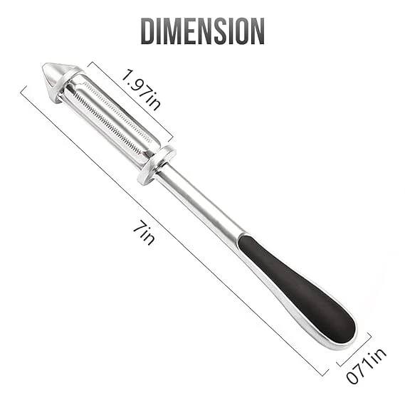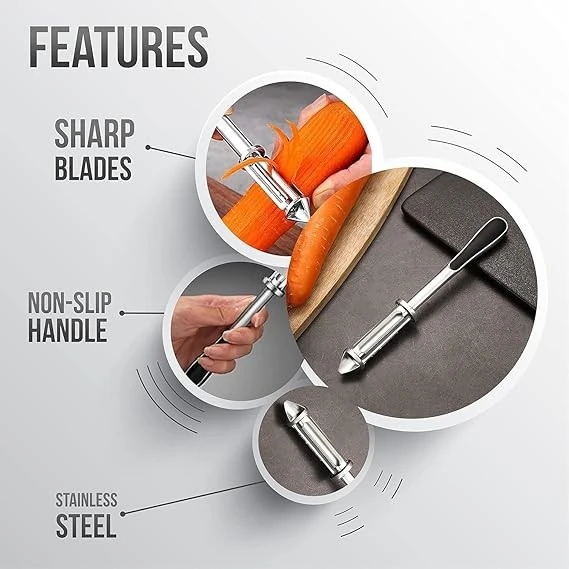 Its ergonomic handle provides a comfortable grip, allowing for smooth and controlled movements, even during extended use. Whether you're peeling carrots, potatoes, cucumbers, or apples, our Vegetable Peeler glides through with minimal effort, saving you time and energy in the kitchen.The compact and sleek design makes storage a breeze, fitting neatly into any kitchen drawer or utensil holder.