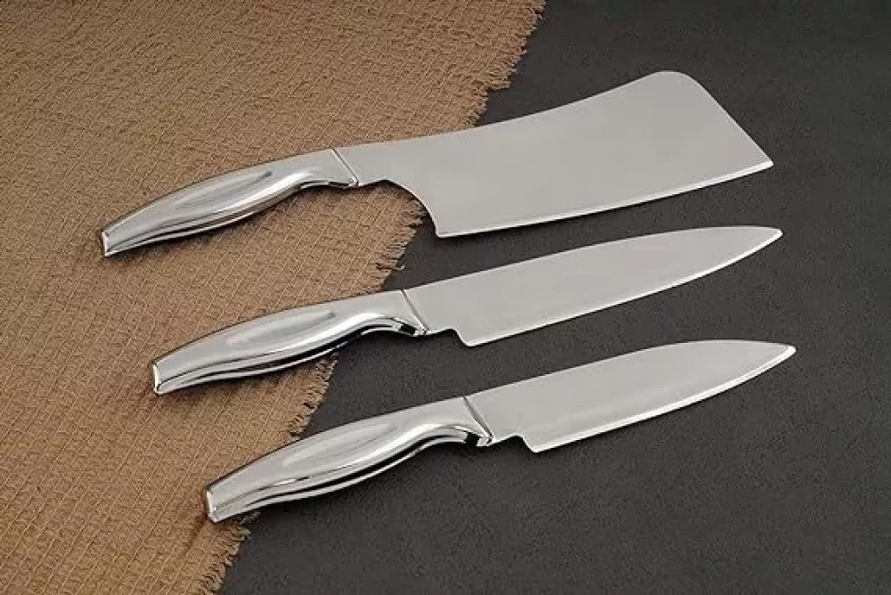 Introducing our Stainless Steel Kitchen Tool Set in a sleek silver finish. This set includes a versatile chopper, precision chef knives (small and big), and a spacious chopping board. Crafted for durability, these tools add both style and functionality to your kitchen. Remember to keep them away from corrosive liquids for long-lasting use. Elevate your culinary experience with this essential stainless steel set.