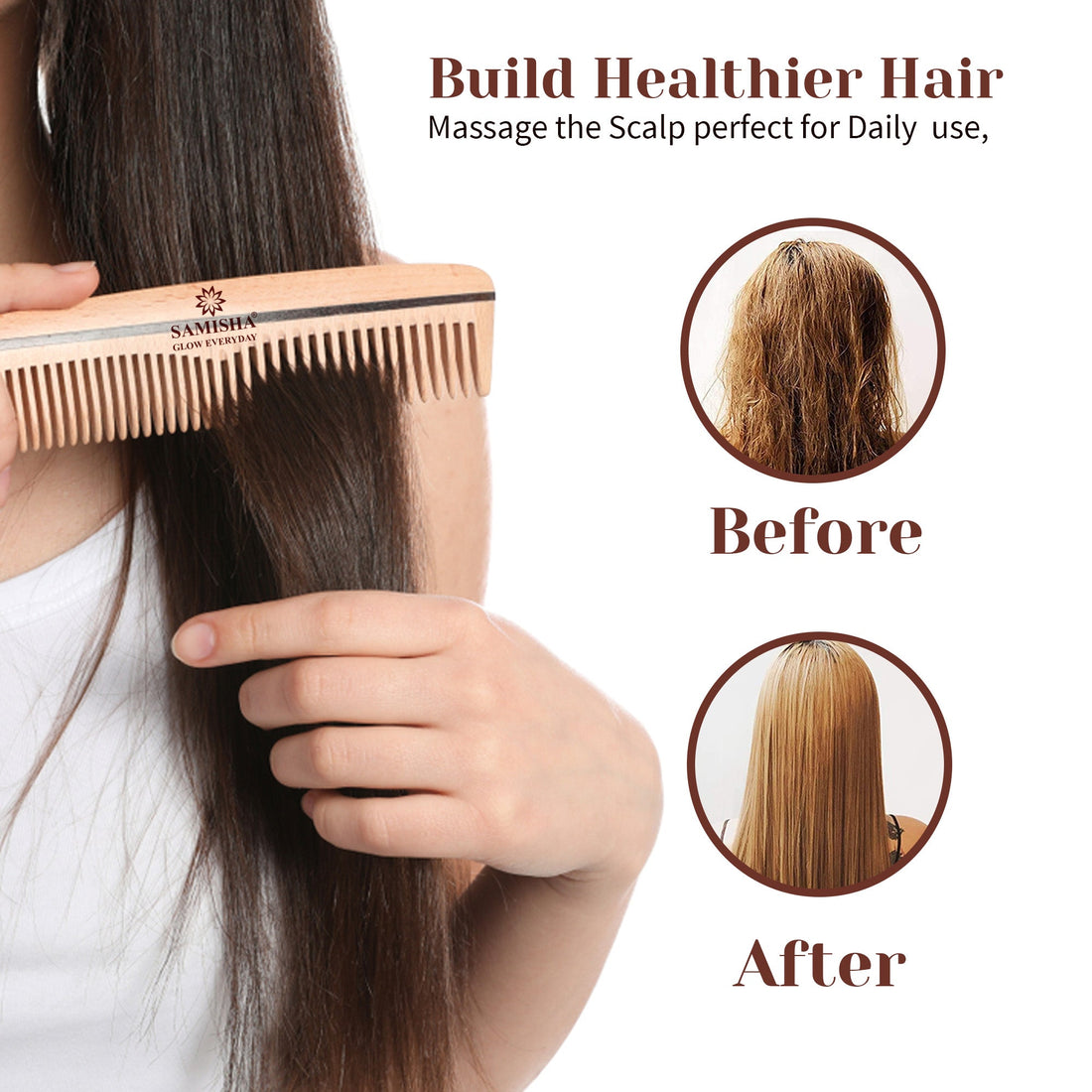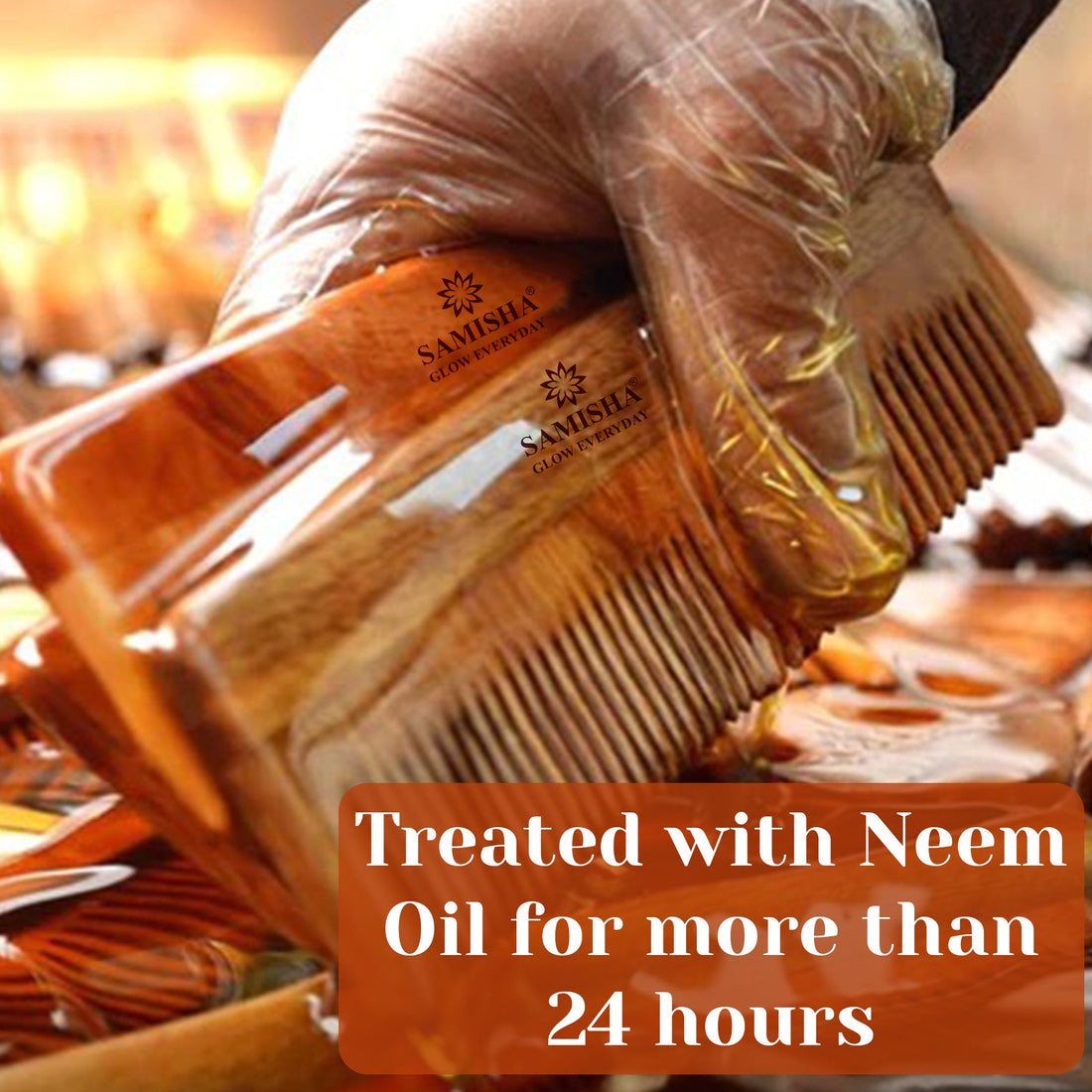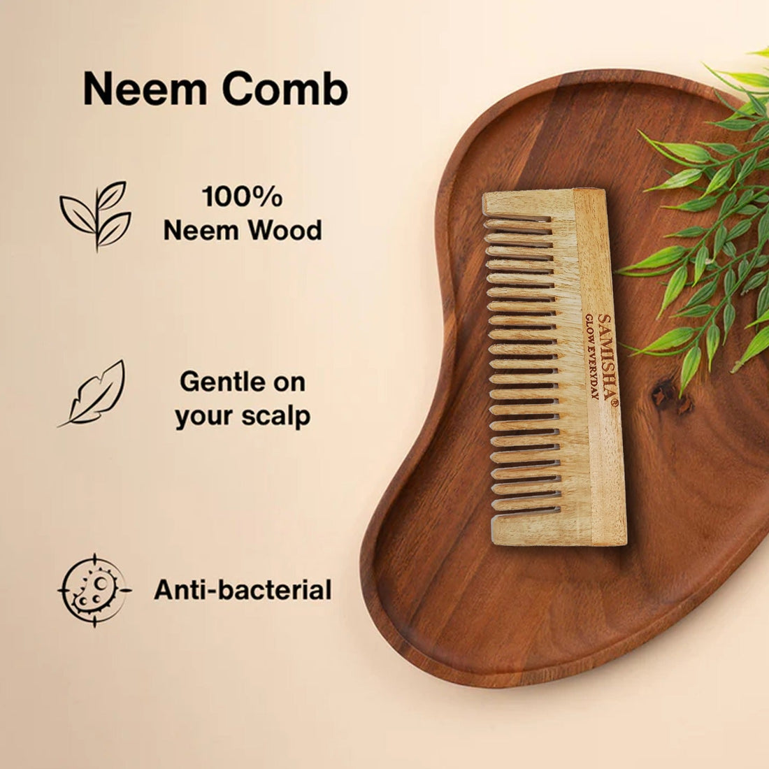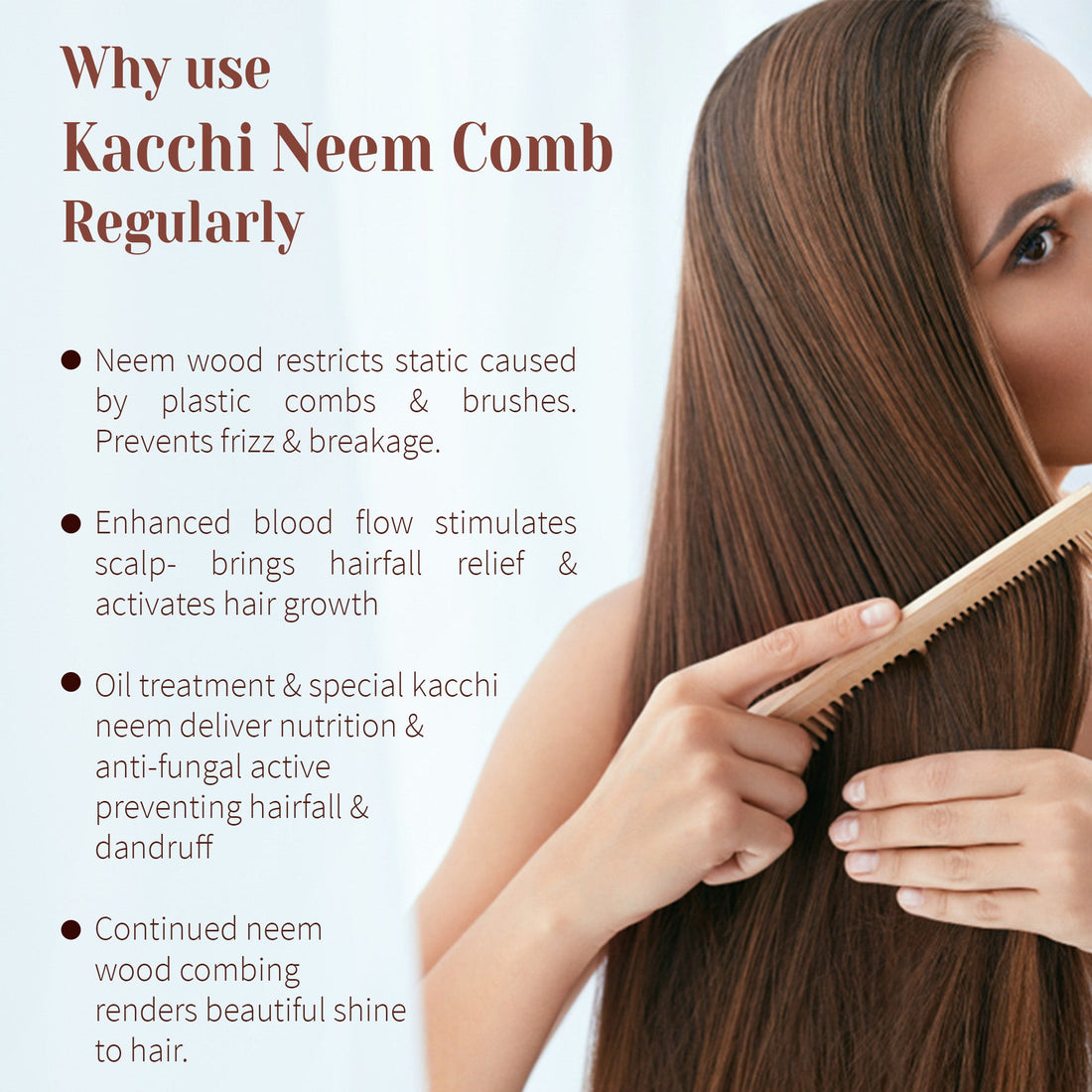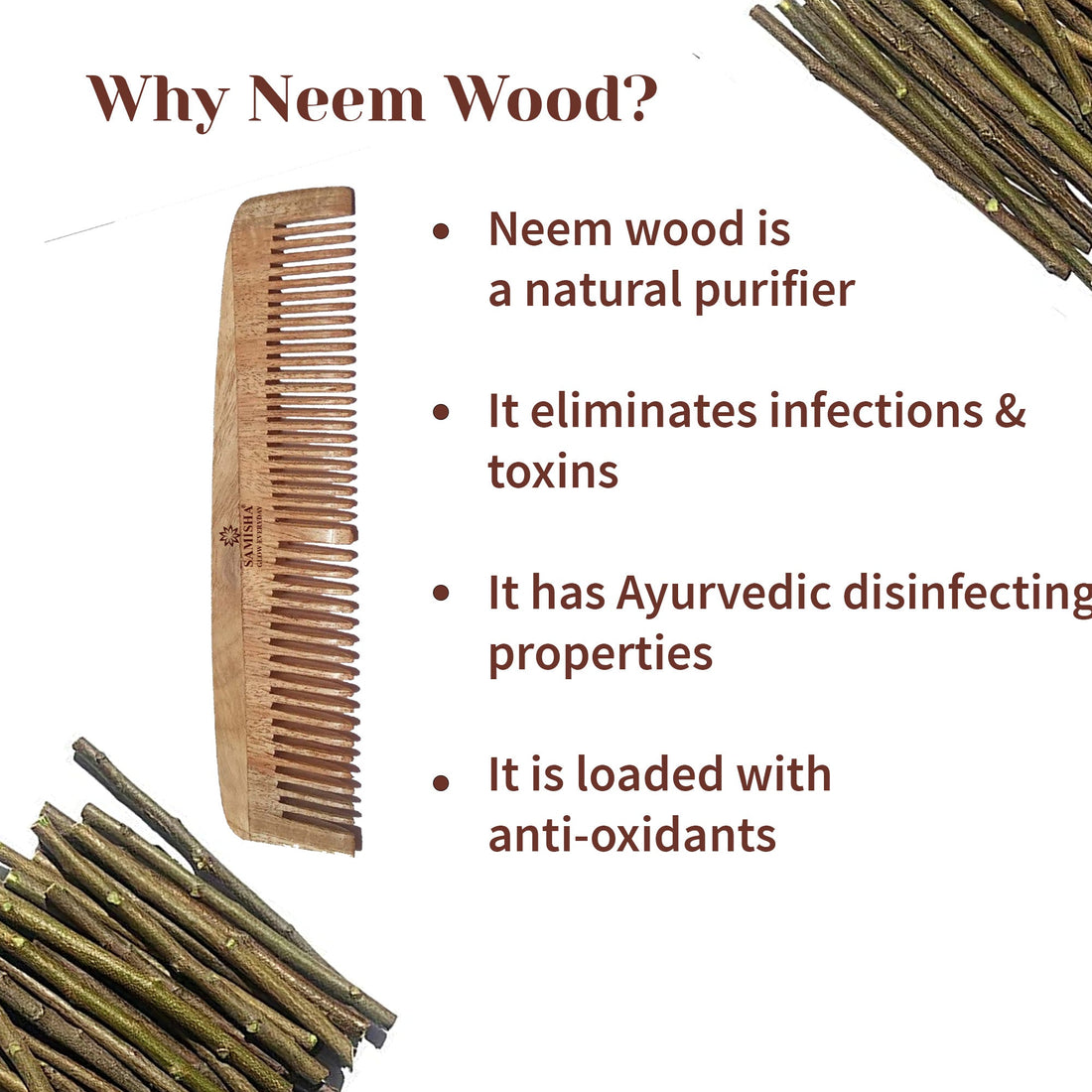 Oil & Herb Treated: Neem Comb Is Pre-Soaked & Treated With Neem Oil, Coconut Oil, Castor Oil, Sesame Oil, Neem Leaves, Bhringraj, Amla, Curry Leaves And Other Herbs & Oils. 17 Herbs Used To Soak & Treat The Comb. Ingredients: Pure Neem Wood: Neem has antifungal properties that may help within the treatment of dandruff. The effective use of neem to your hair can relieve the itchiness, inflammation, and irritation associated with dandruff. The regenerative properties of neem help in reducing hair fall. How to use: Step 1: Detangle your hair using fingers. Step 2: Begin combing from ends moving towards the roots. Step 3: Comb thoroughly to stimulate blood circulation. Benefits: It is eco-friendly, handcrafted with 100% Neem Wood. It helps to keep your scalp nourished and free of dandruff. People of any age and with any hair type can use it. It promotes healthy scalp and hair growth. It is non-static, has rounded teeth and is very gentle on your hair & scalp.