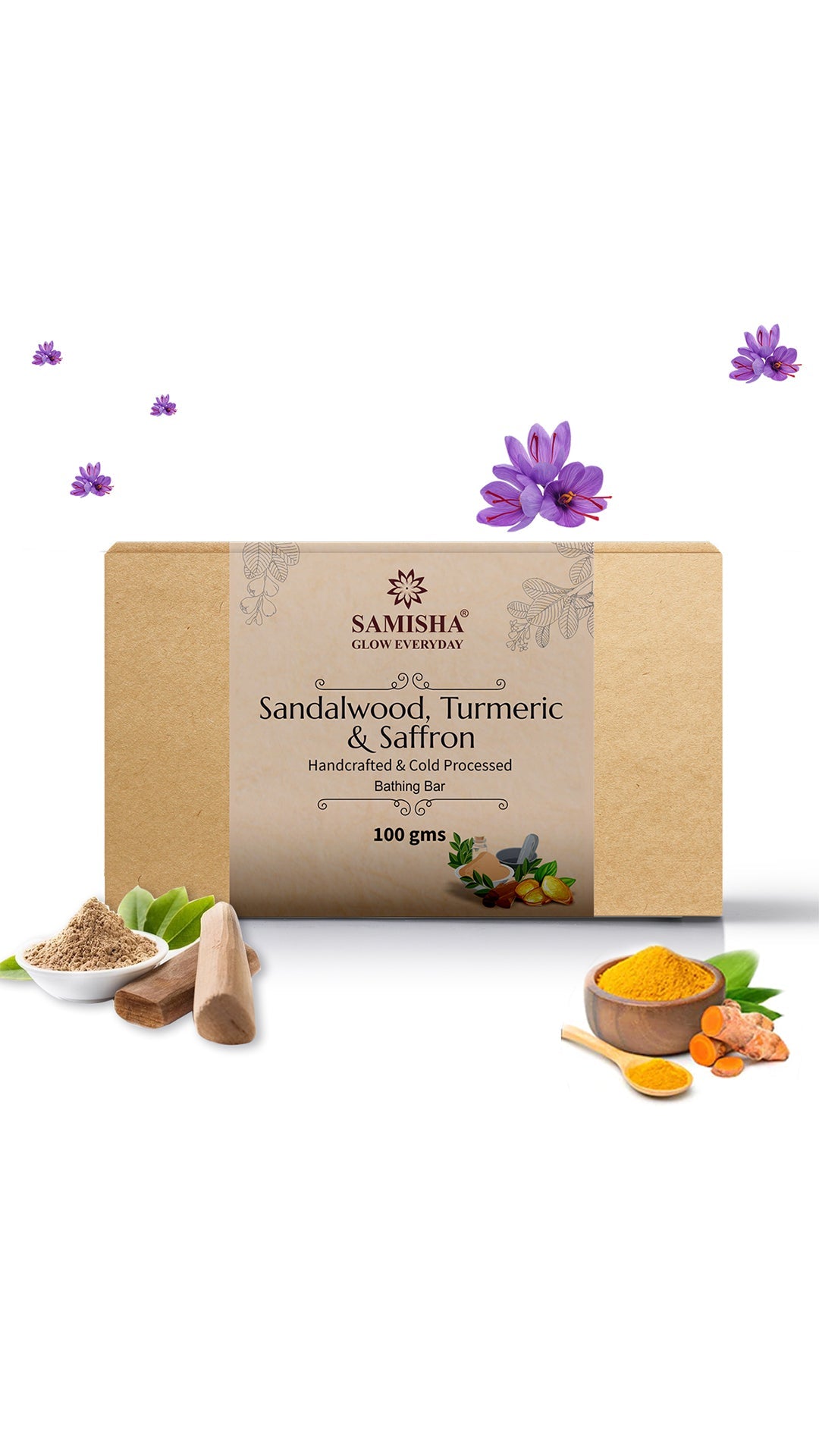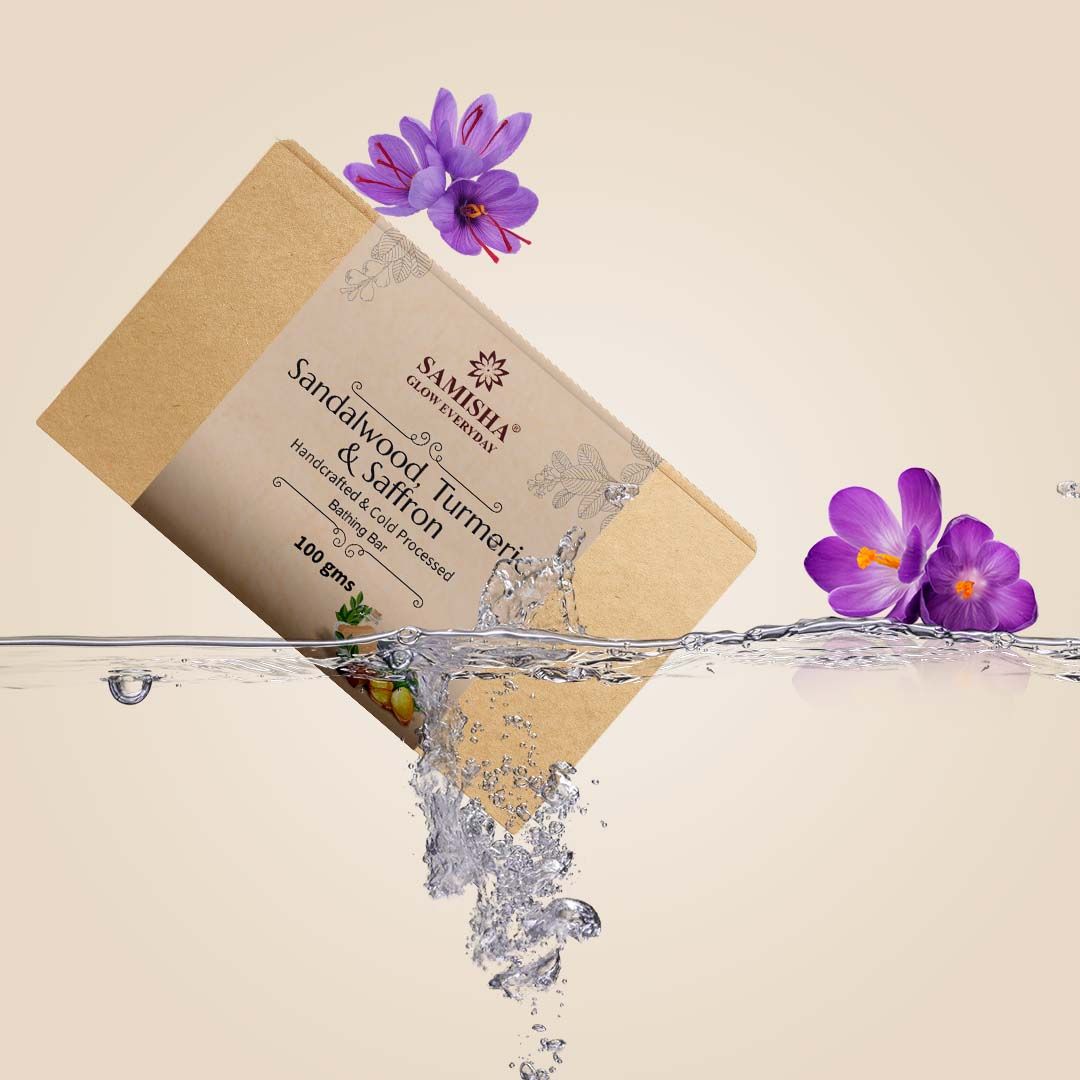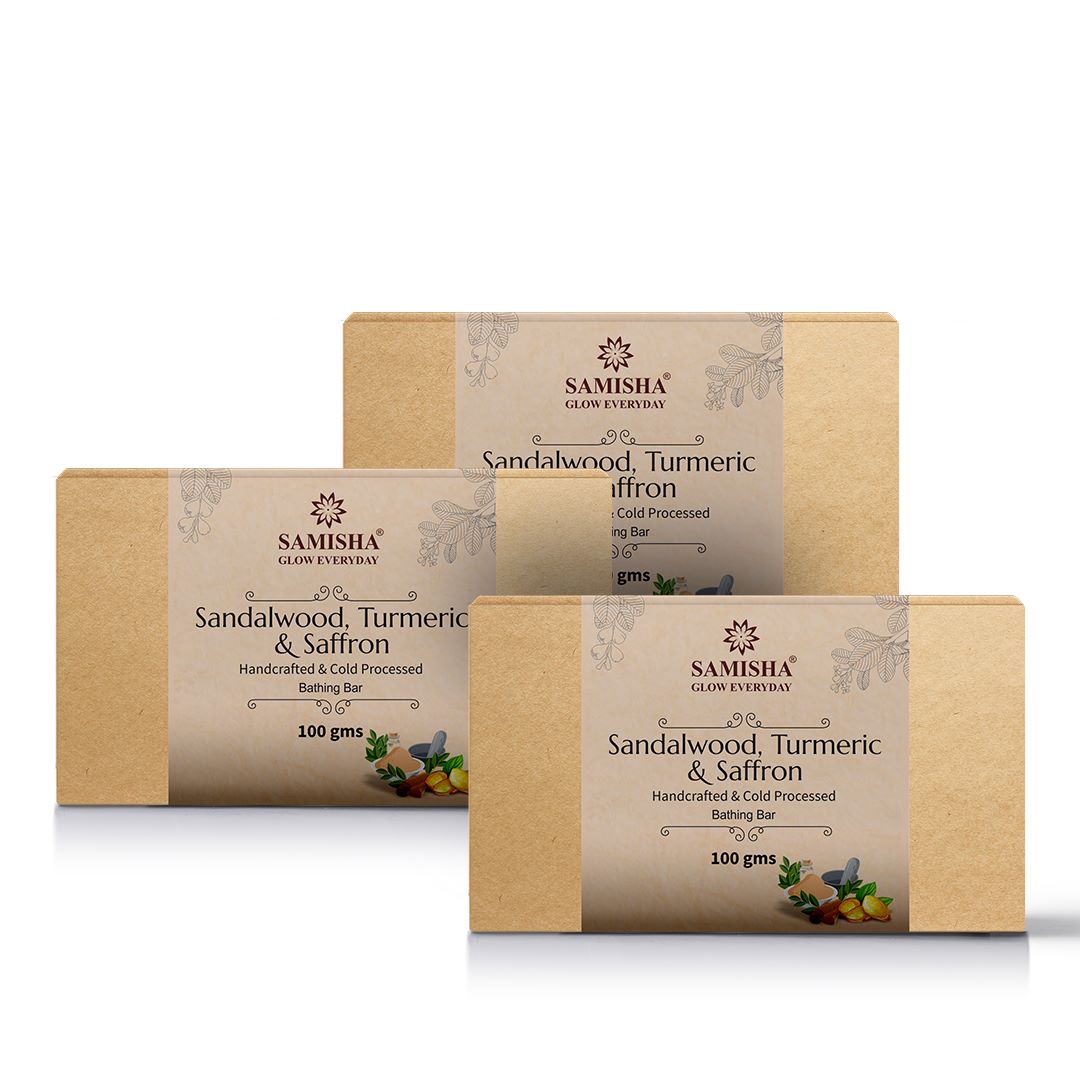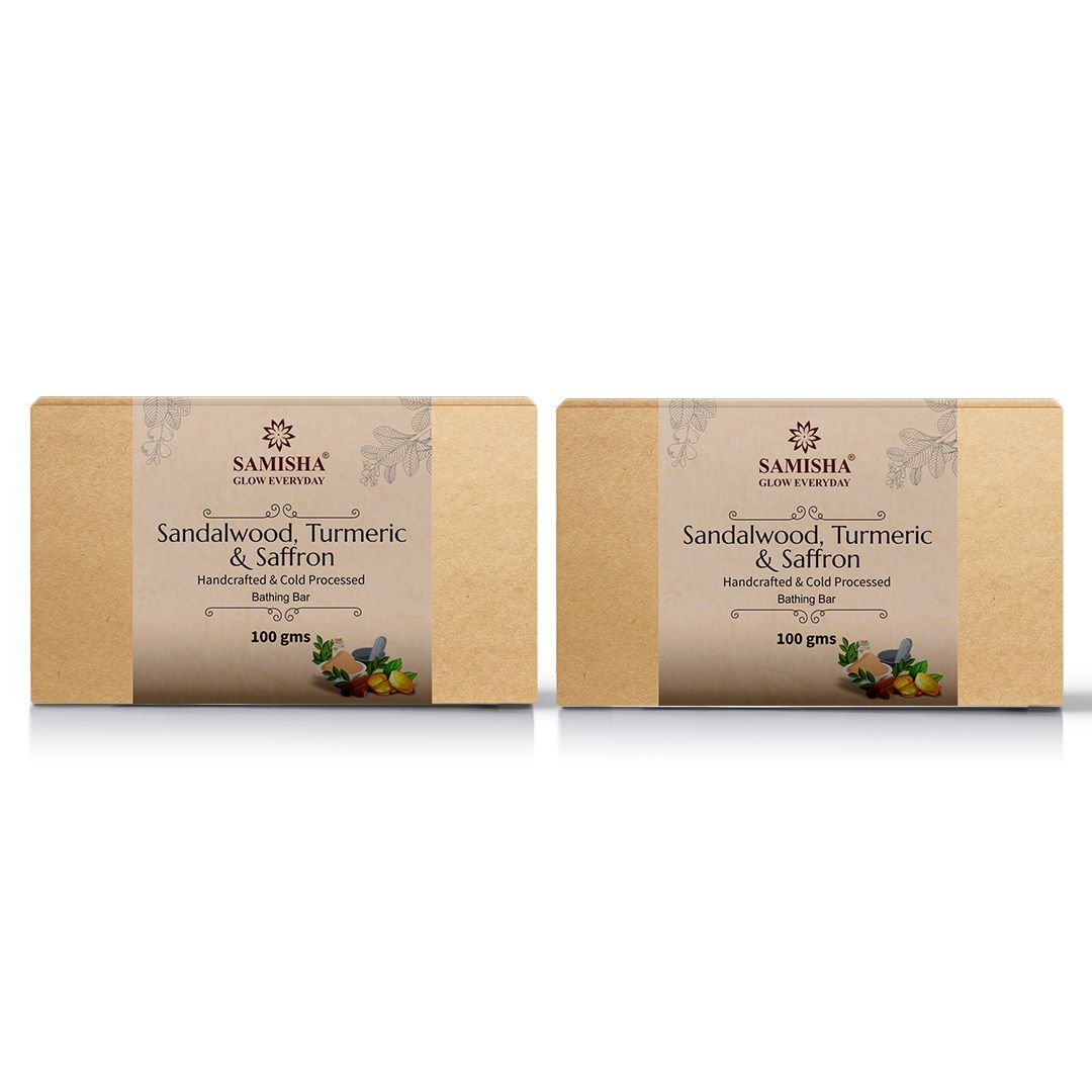Hand-Crafted Natural Cold Pressed Soap Bar Refreshing & stimulating pure bathing experience Naturally Clean & Pure Skin Natural Ingredients to hydrate & rejuvenate skin Best of Nature formulated by Ayurveda Ingredients: Sandalwood: fights skin aging and lightens blemishes on the face Turmeric: prevents skin cells from clumping together and clogging the pores. Since it's antiseptic and antibacterial, it may effectively stop the growth of acne-causing bacteria. Saffron: fights skin aging and lightens blemishes on the face How to use: Apply on wet face, body & massage in circular motion Lather well to remove dirt & grease Rinse thoroughly & pat dry the skin Benefits: Our Soaps are Non-cruel Very Smooth on Skin No Chemicals or Pesticides It has Better Healing Properties Maintain PH level