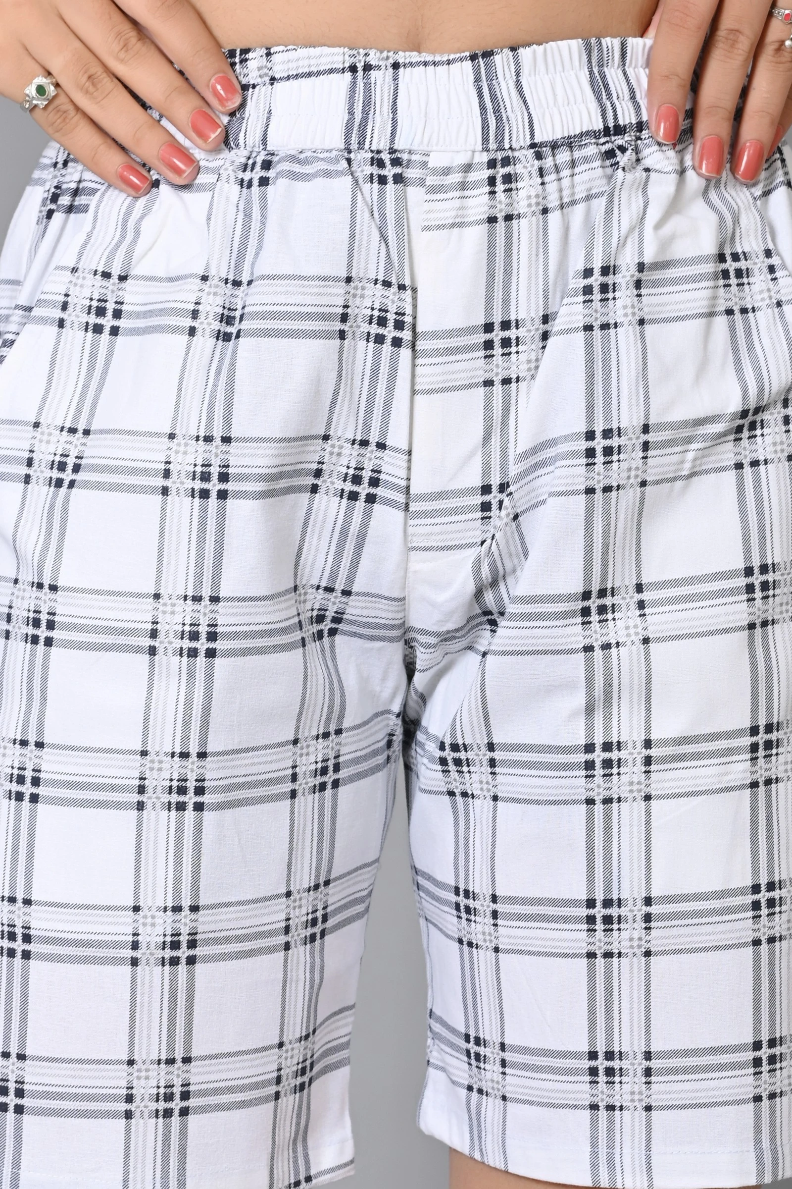 Transform your casual wardrobe with our White Checkered Cotton Blend Shorts, meticulously designed to infuse comfort and style into your everyday fashion. The timeless checkered pattern introduces an element of sophistication, making these shorts a versatile and chic addition to your clothing repertoire.