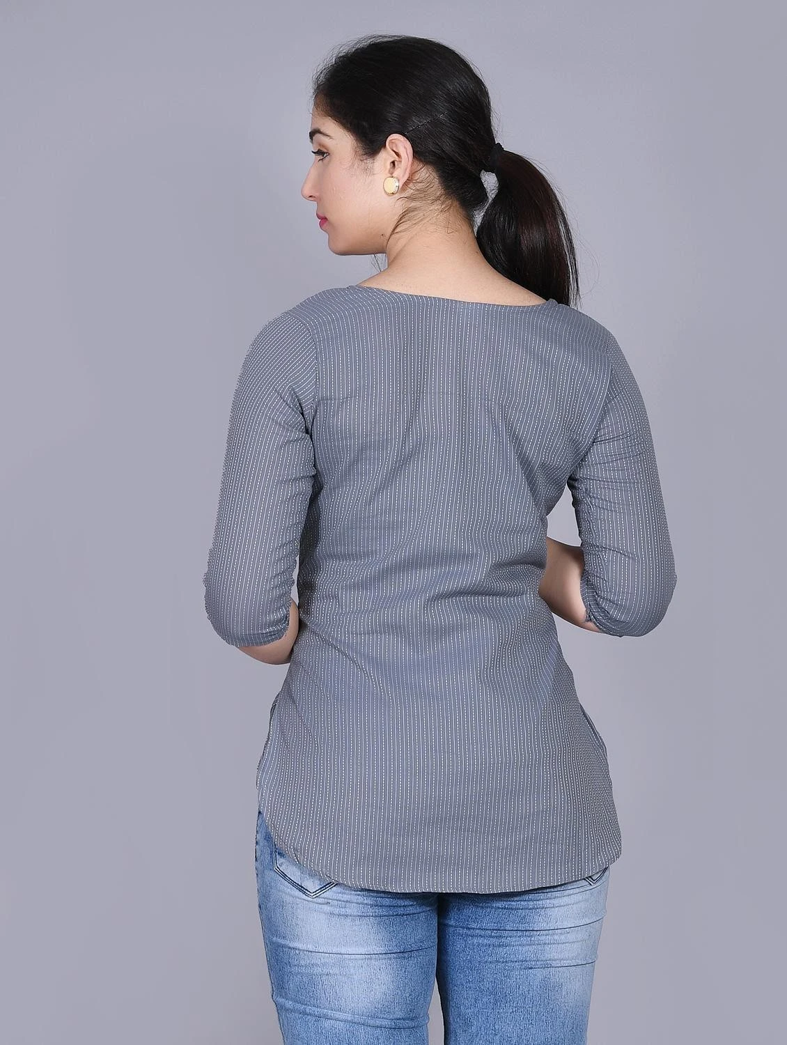 Elevate your casual wardrobe with sophistication by adorning this Grey Cotton Blend Straight Kurta, specially designed for women who appreciate timeless style. The hip-length kurta, featuring a sweetheart neck and 3/4 sleeves, is perfect for various occasions, adding a touch of grace to your ensemble.
