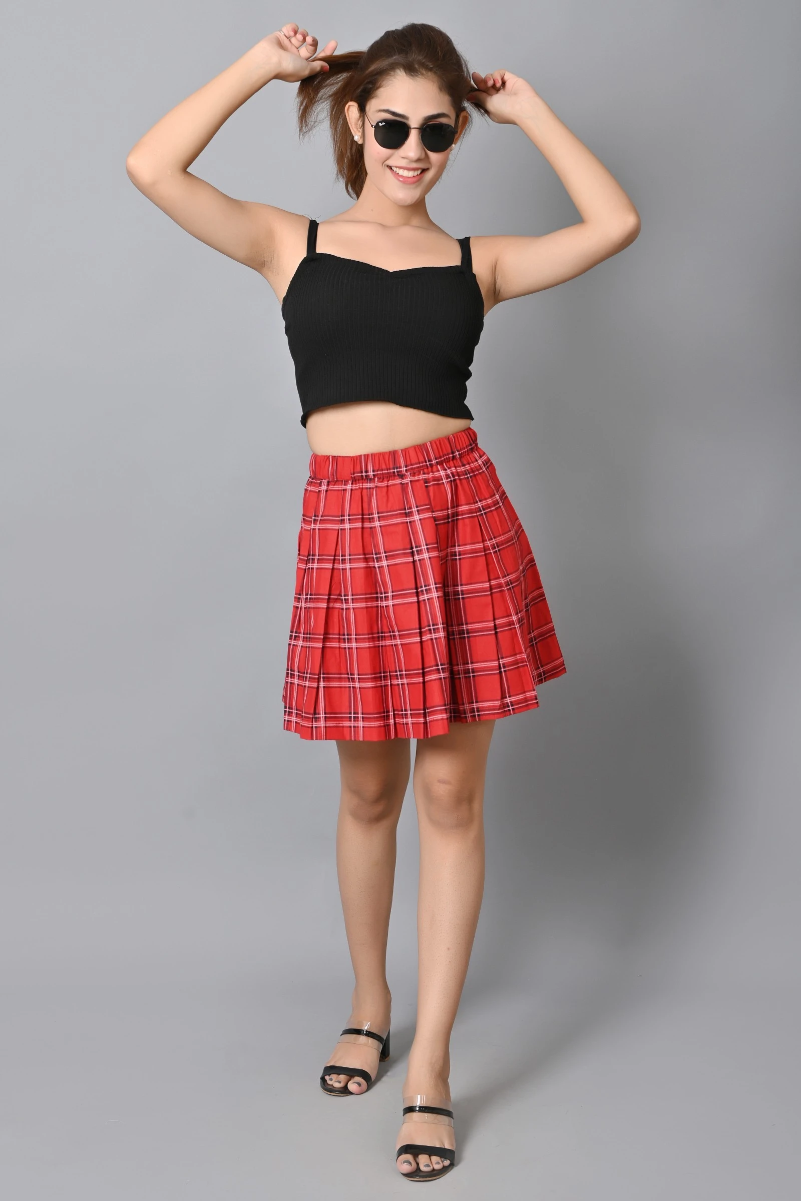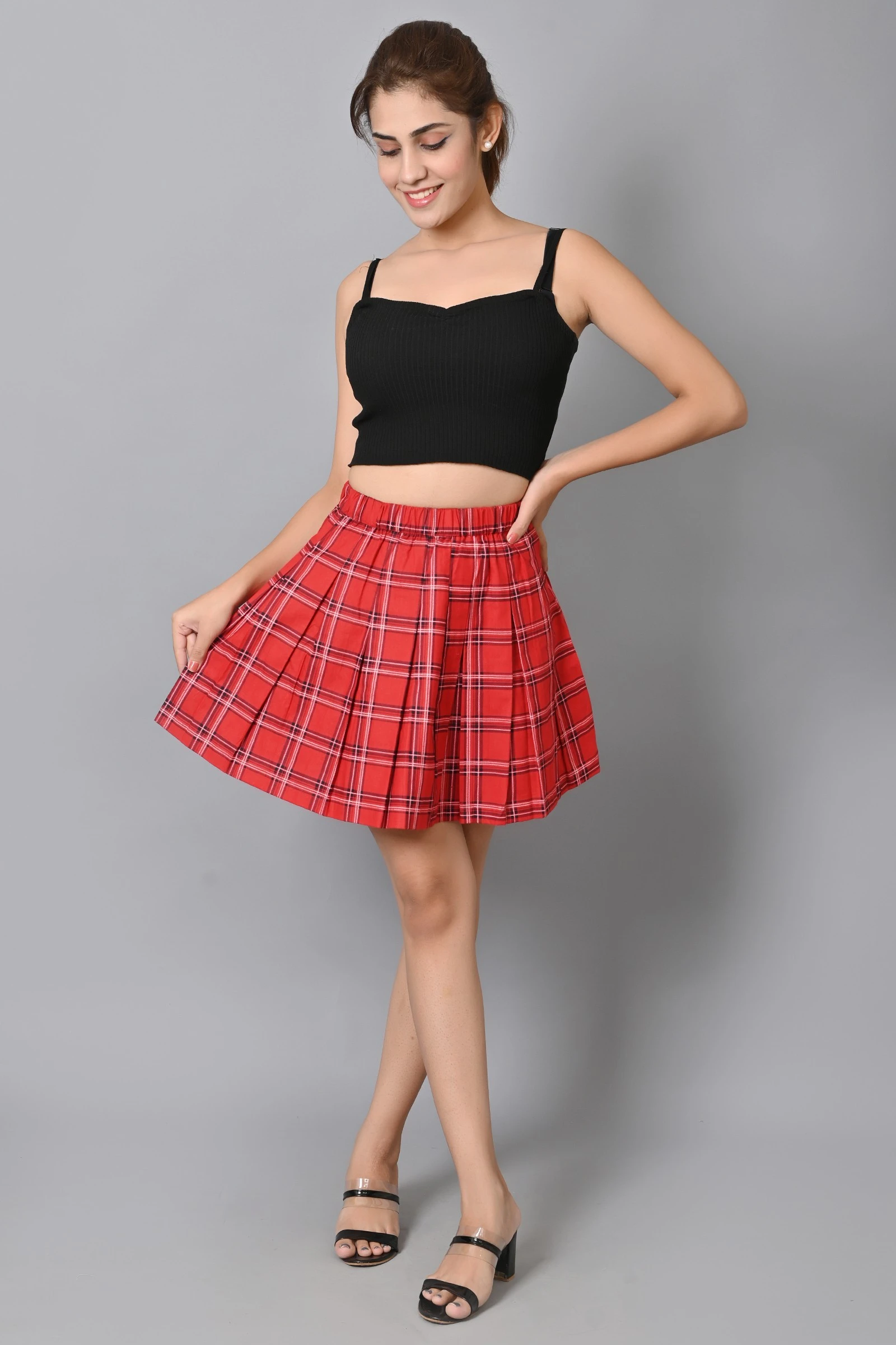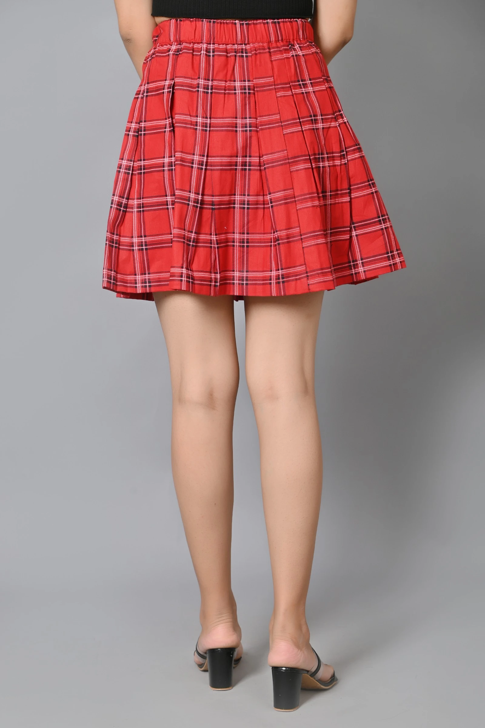 Women Checkered Pleated Red Skirt