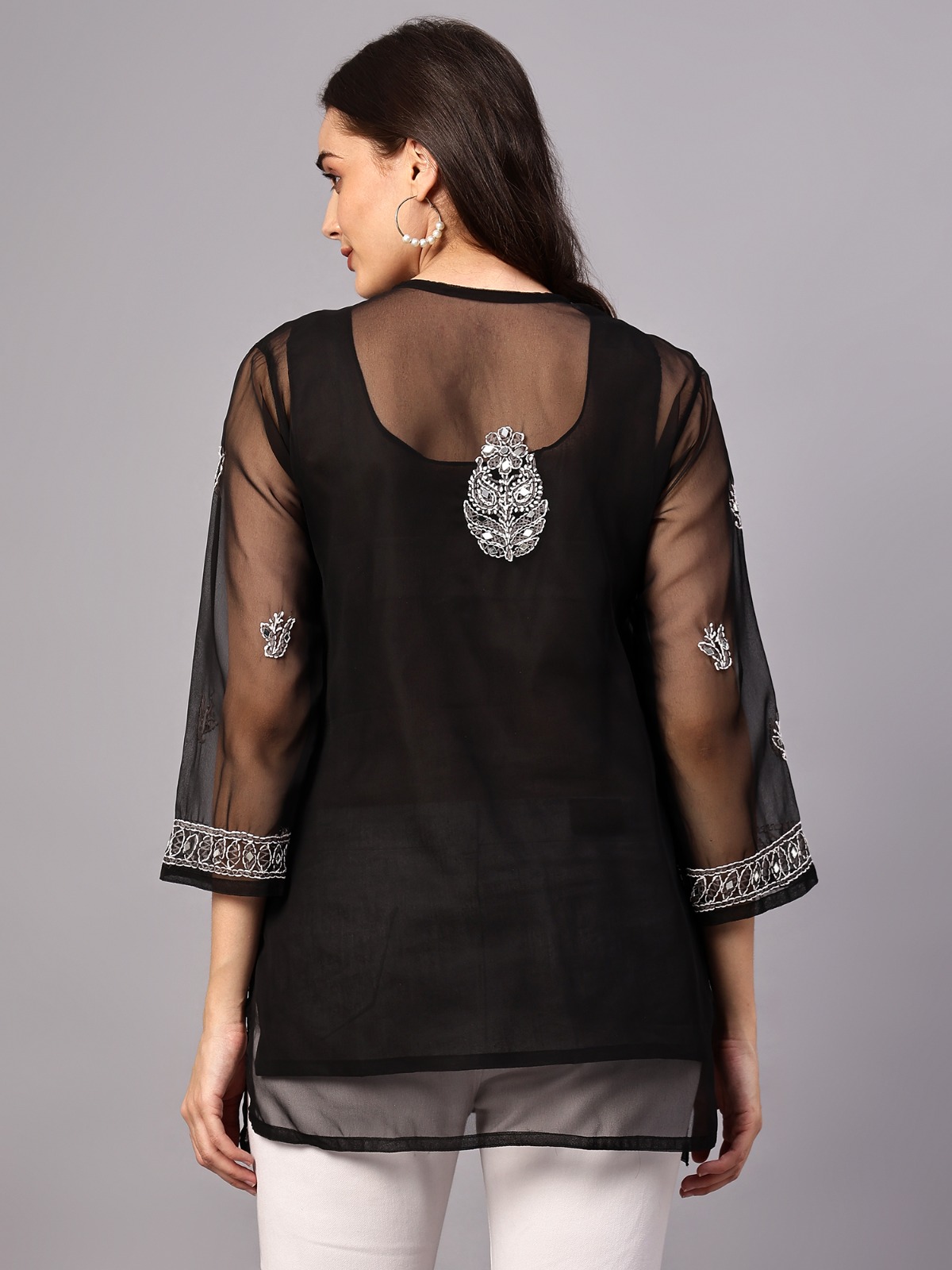 Elevate your ethnic charm with this exquisite black georgette kurti, meticulously hand-embroidered in traditional Lucknowi Chikankari style. Adorned with delicate mirror work, this kurti is a blend of classic artistry and modern elegance. The intricate white thread floral embroidery over sheer georgette fabric offers a luxurious look, ideal for festive gatherings, casual outings, and semi-formal events. Pair it with palazzos, churidar, or straight pants for a graceful ensemble.