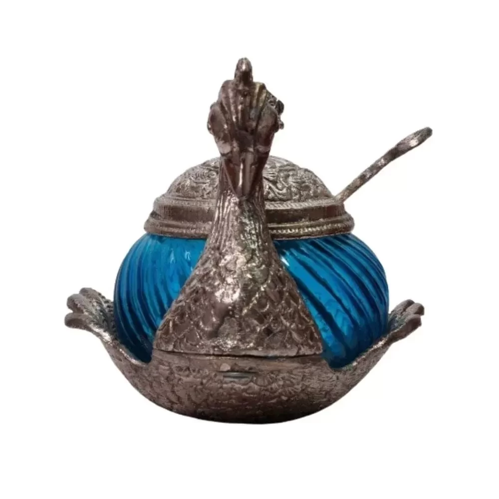The product is made of white metal, and mid-portion of the bowl is made of turquoise coloured glass to render transparency and visibility of the things kept inside.