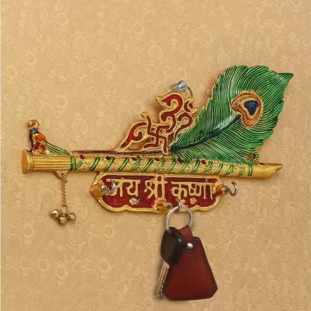 Metal Key Holder Krishna Flute Design with More pankhi Hanging for Home Décor. This metal key stand is blessed with a krishna's flute design which gives a nice classy and beautiful look to your house walls.