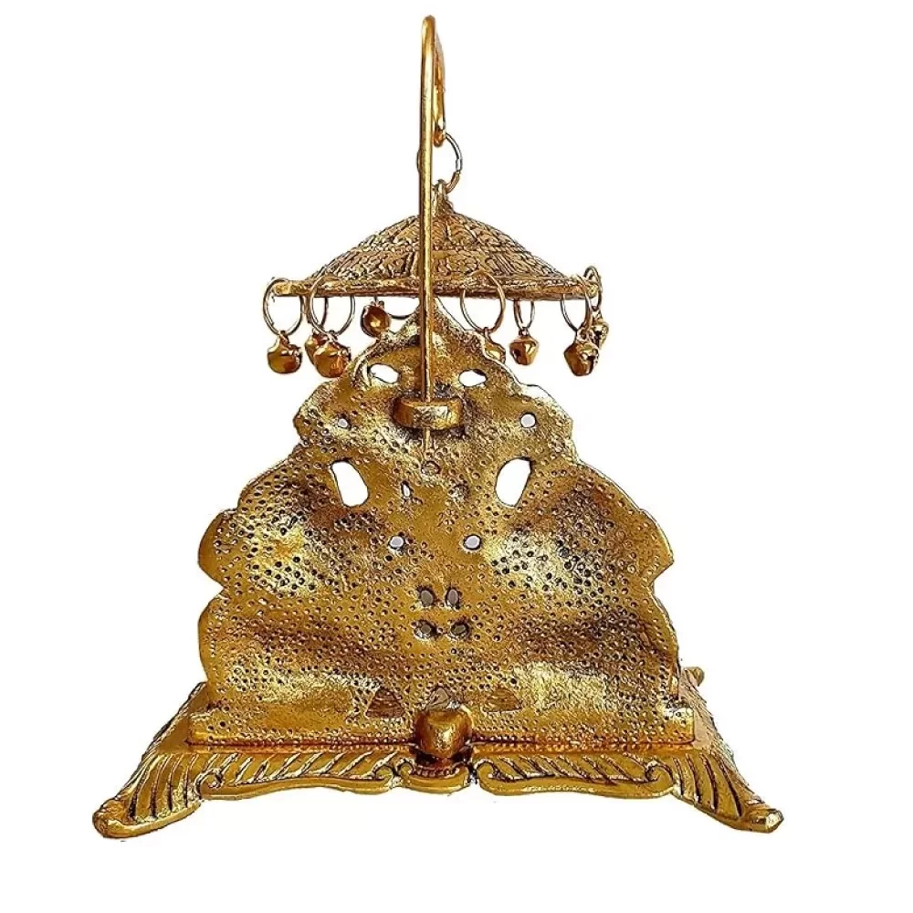 The throne is made of beautifully carved elephants. The idols of gods can be placed on the red cloth and the chhatra is there to cover the idol.This beautiful and innovative designer singhasan by Radhika Gift Items is an amazing piece of art. It is a very beautiful piece to be kept in any pooja room.