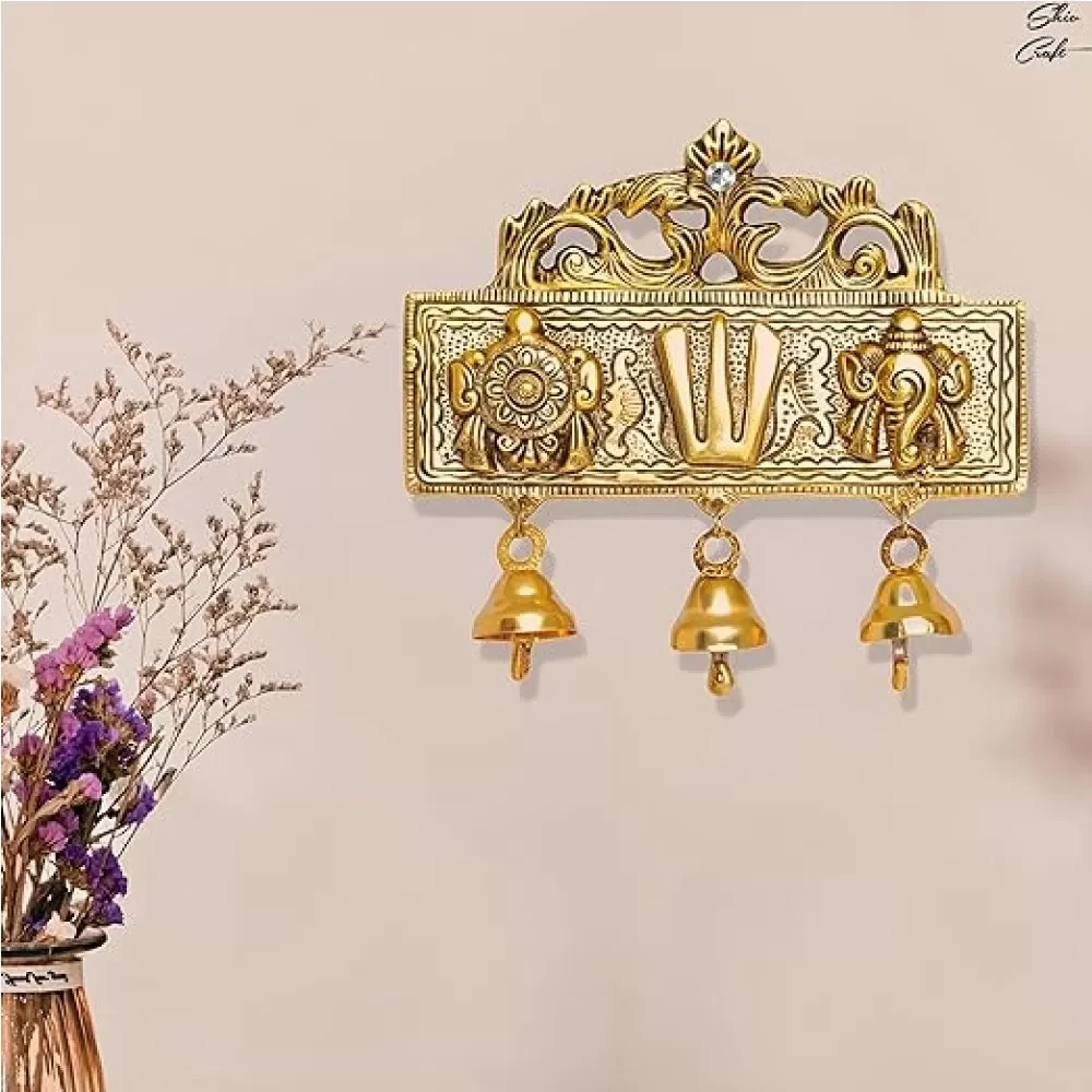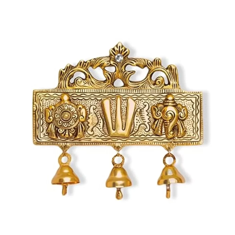 This Tirupati Door Wall Hanging Shankh Chakra Namah with Bells has been coated in gold colour tones This exquisite design is filled with traditional sophistication and is sure to draw attention in any setting. When you place this magnificent showpiece in your home, you will create a decorative home with this cast metal ornamental art while sticking to classic design.