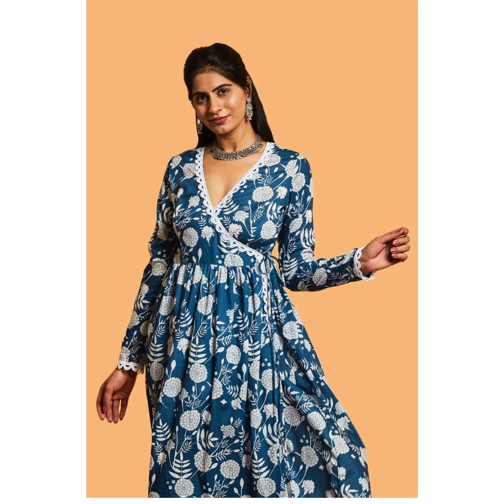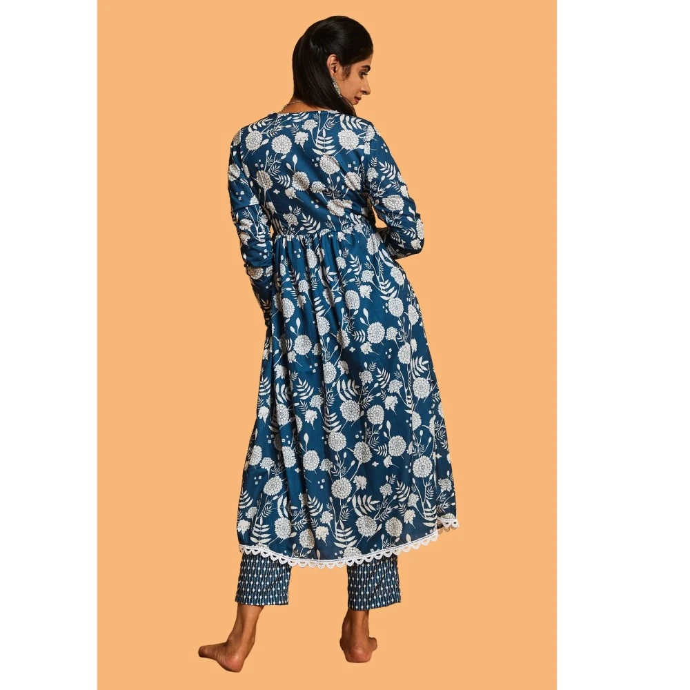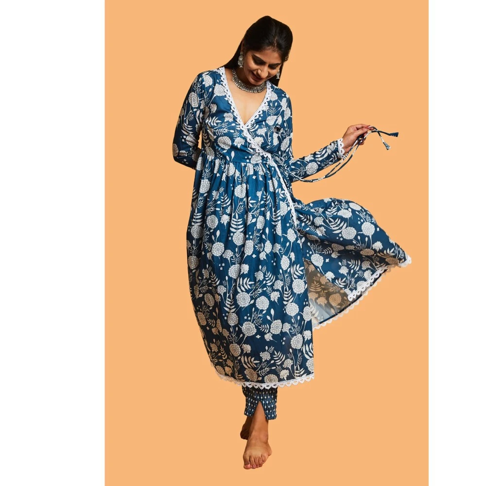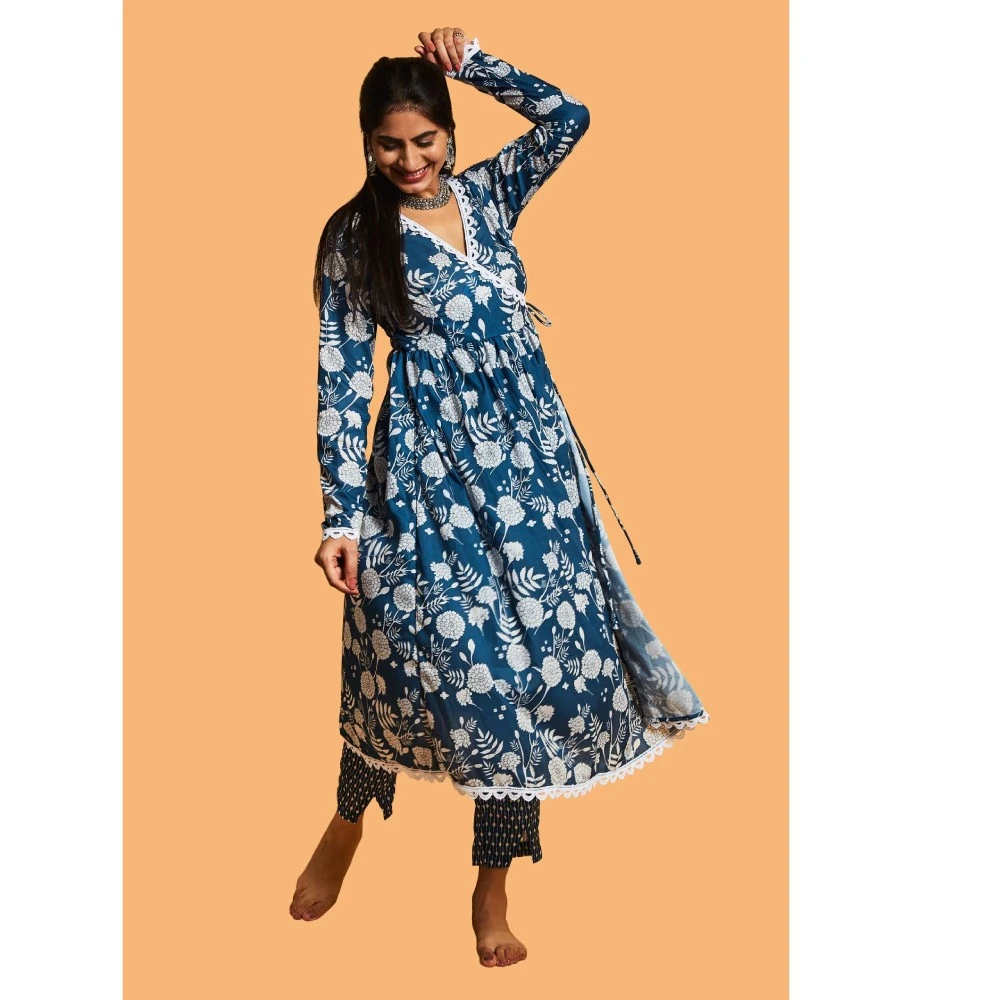 Design: The Angrakha style adds a distinct flair to this suit set, creating a visually appealing and unique silhouette. The layers of white printed flowers enhance the overall sophistication of the ensemble, ensuring you stand out with grace and charm.