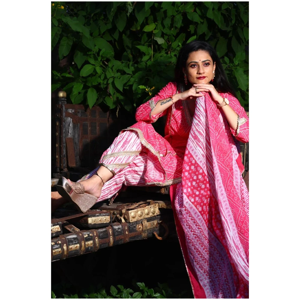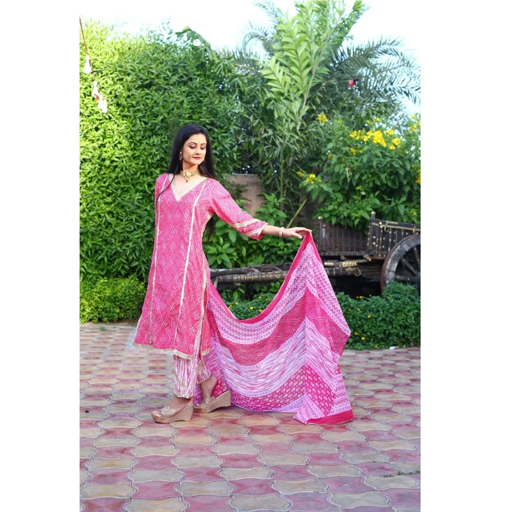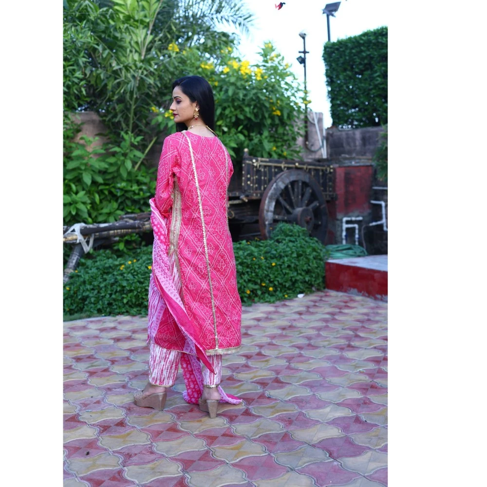 Introducing our “Radiant Rajasthani Charm” Bandhej Print Suit Set, a celebration of style and tradition in the captivating shade of Hot Pink. Crafted from premium cotton, this outfit seamlessly blends elegance with comfort. The set includes a kurta, straight fit pants, and a matching dupatta, making it a versatile choice for any occasion.