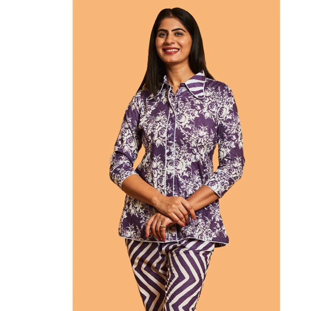 Introducing Our Cotton Violet with White Flowers Co-ord Set: Embark on a journey of tranquility with our Cotton Violet with White Flowers Co-ord Set. Immerse yourself in the calming embrace of violet hues adorned with delicate white floral patterns. This ensemble transcends mere clothing; it's an invitation to experience serene elegance. Key Features: Tranquil Elegance: Violet Bliss: The soothing violet color, combined with intricate white flowers, creates an ensemble that exudes tranquility and timeless charm. Delicate Florals: The subtle white flowers add a touch of grace and femininity, enhancing the overall aesthetic of the co-ord set. Chic Design Elements: Three-Fourth Sleeves: Elevating the design, the three-fourth sleeves strike a perfect balance between modesty and contemporary style. Front Buttons: The front buttons not only serve a functional purpose but also introduce an element of allure. Customize the neckline to suit your preference, offering versatility in styling. Versatile Styling: Effortless Pairing: Create an elegant and graceful look by pairing this co-ord set with straight-leg pants. The ensemble seamlessly transitions from casual chic to sophisticated elegance. Day-to-Night Appeal: From daytime events to evening gatherings, this versatile co-ord set effortlessly adapts to your schedule, ensuring you look and feel your best throughout the day.