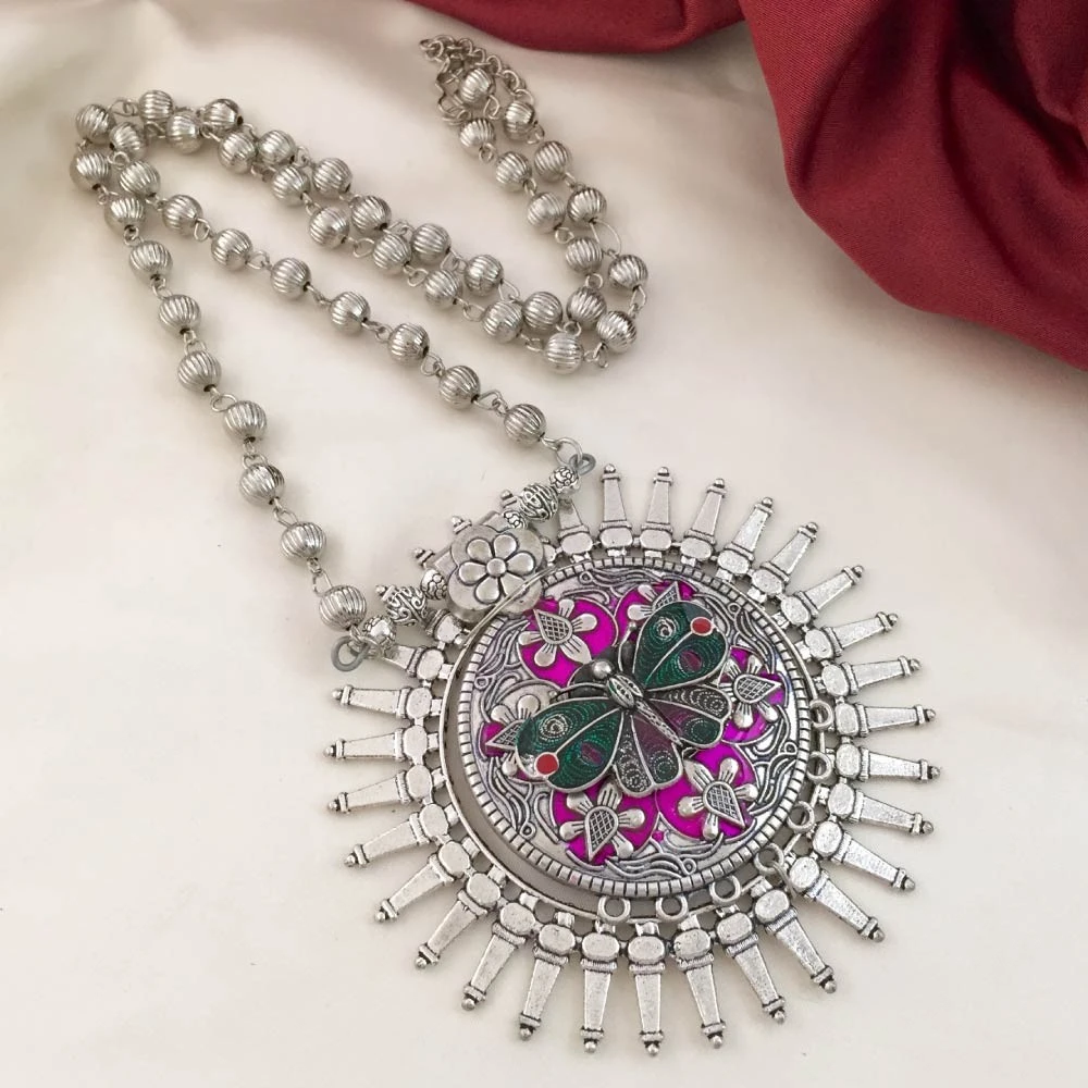 • The meenakari work is likely crafted on a pendant or specific sections of the haram, contrasting beautifully with the oxidized metal finish.