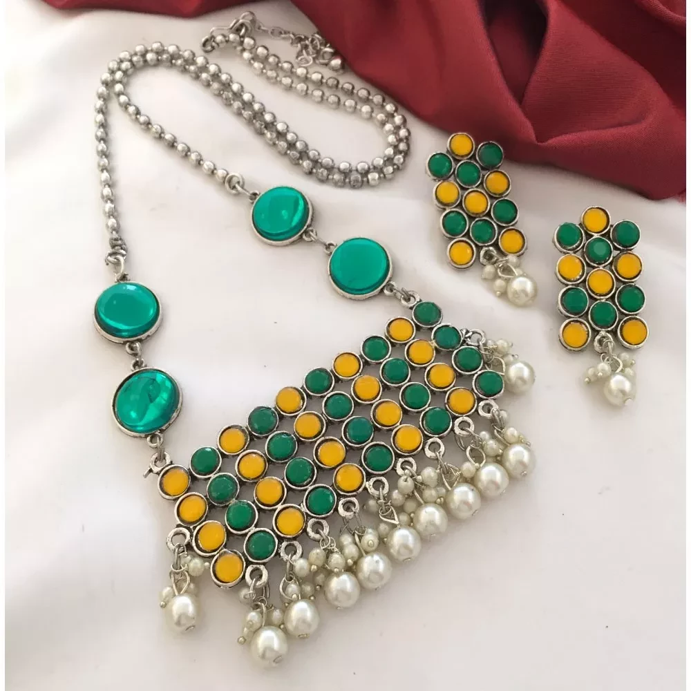 Design: Inspired by the rich heritage of Indian jewelry, this haram features a modern twist on classic motifs. The central focus is the yellow and green detailing, which adds a fresh and youthful touch to the oxidised metal.