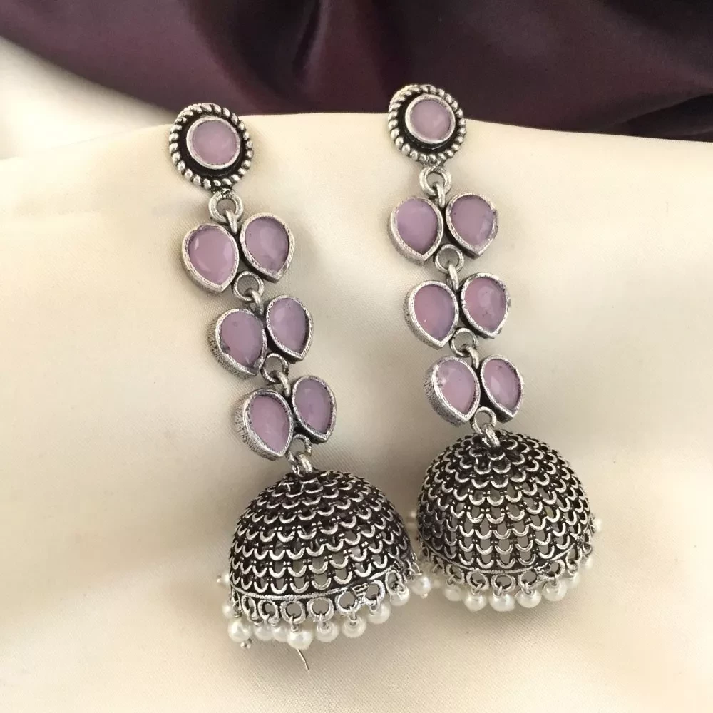 Oxidised Layered Light Pink Earrings Silver Finish