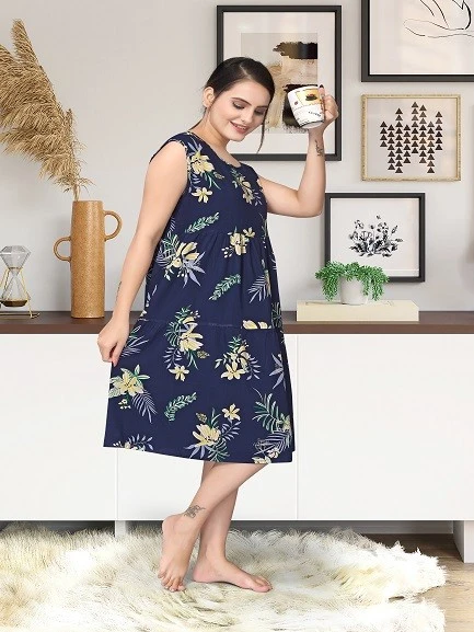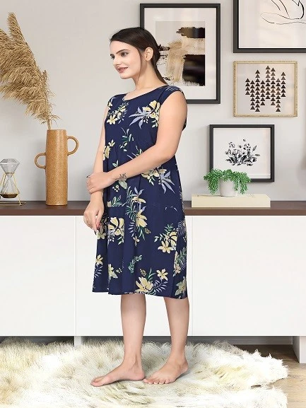 Indulge in the luxurious feel of Viscose Rayon as you unwind in this Navy Blue Nighty. The captivating printed design adds a touch of glamour, making it a delightful and sophisticated addition to your nightwear collection. The V-Neck design enhances the overall feminine appeal, while the slip-on closure allows for easy and hassle-free wear.