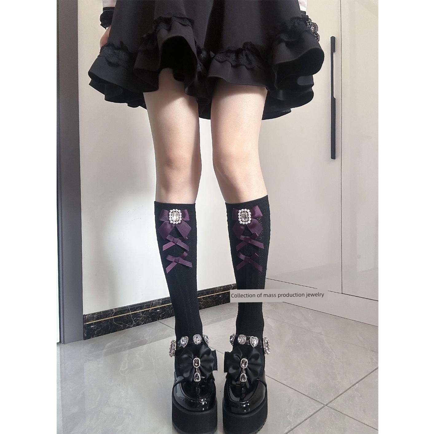 Japanese Style Mass-Produced Knee High Socks Square Diamond Three Bows Heavy Industry Gem Cotton Mid-Calf Length Socks JK Sweet Autumn and Winter Wild -Black purple mid-tube socks