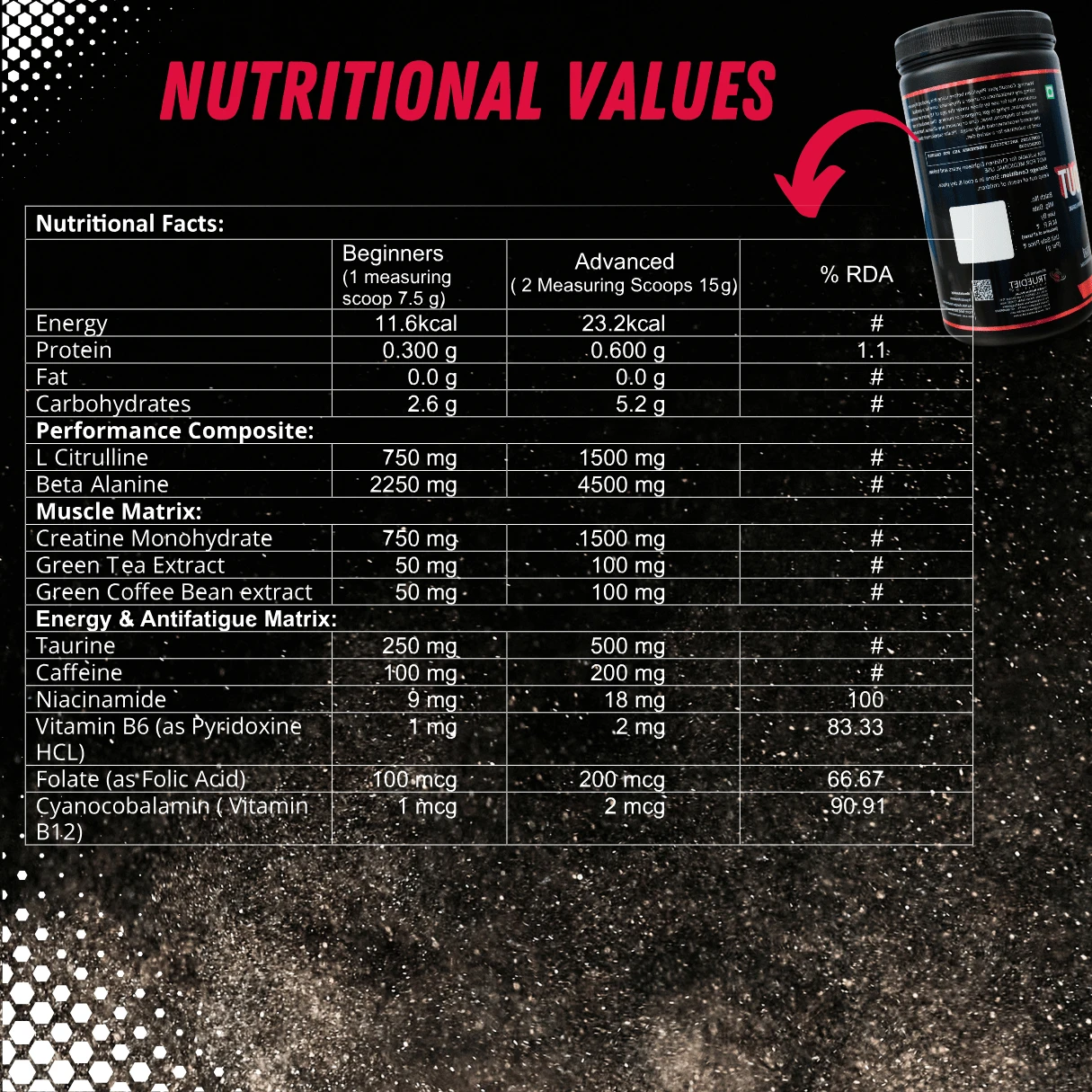 1. Premium Ingredients: Formulated with high-quality ingredients, including L-Citrulline, Taurine, and Caffeine, to enhance energy, focus, and endurance during workouts.