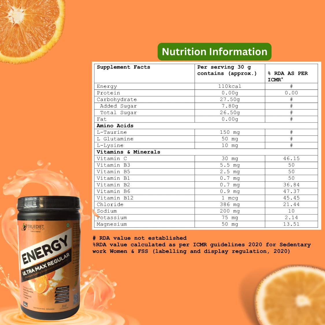 Elevate your energy levels with TRUEDIET Energy Ultra Max Regular, the premium-quality balanced energy drink designed to fuel your day. Infused with the invigorating essence of zesty Orange flavor, each sip delivers a refreshing burst of energy to keep you going.