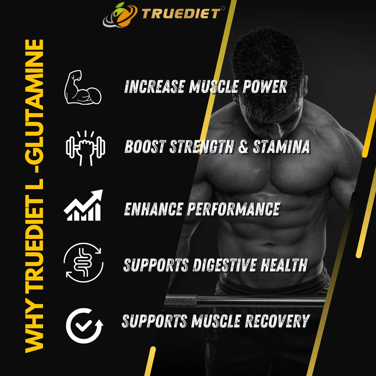 Unlock your body's full potential with TRUEDIET L-Glutamine Supplement Powder. Specifically formulated to support muscle growth and recovery, this premium-grade supplement is your essential post-workout companion. Each serving is packed with pure L-Glutamine, providing your muscles with the fuel they need to repair and rebuild after intense training sessions.