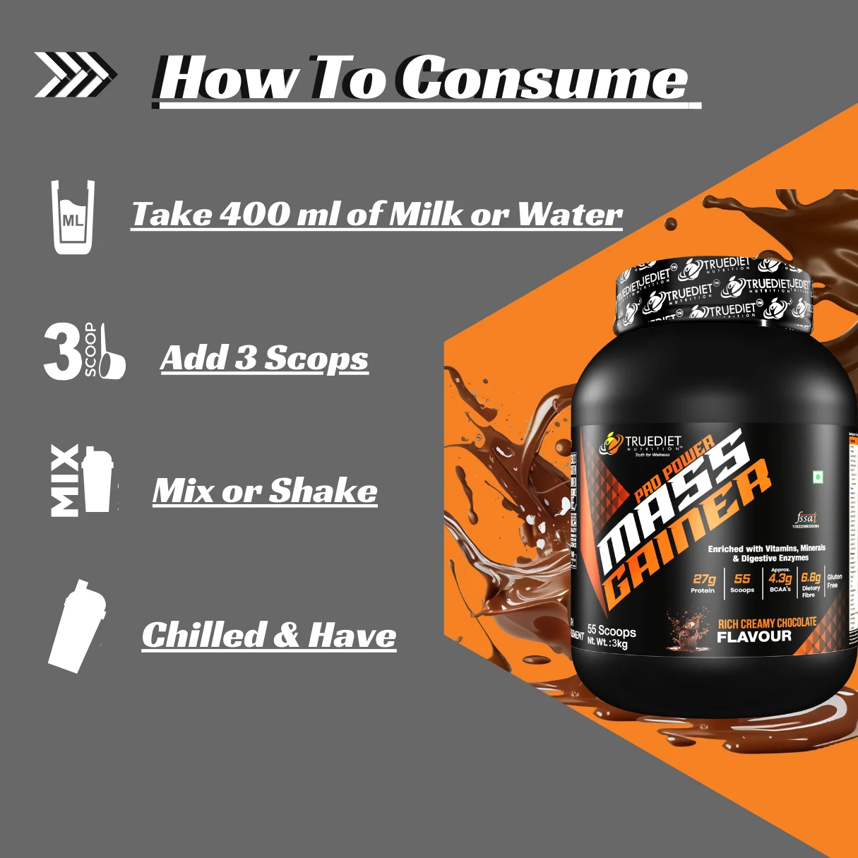 TRUEDIET Pro Power Mass Gainer Weight Gainers Mass Gainers With Vitamins Minerals and Digestive Enzymes 3 kg Creamy Chocolate Flavour
