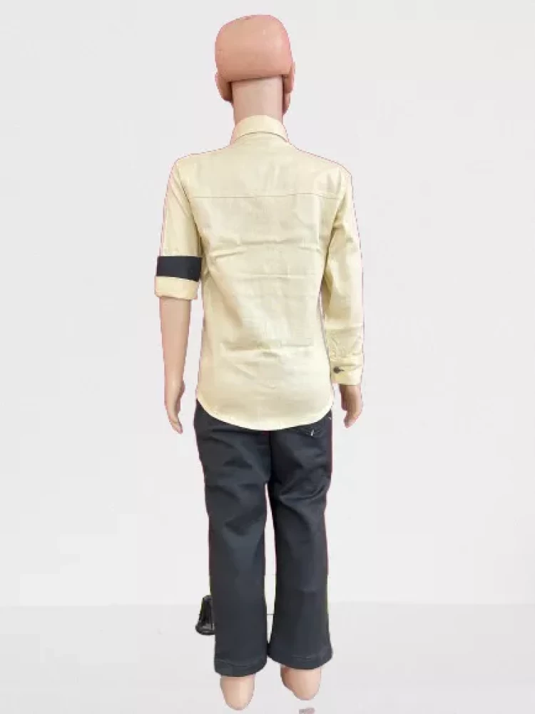 The set includes knitted lycra details on both the shirt and pant, adding a contemporary edge to the classic silhouette. The knitted lycra accents provide a contrast in texture and elevate the overall look of the ensemble, creating a modern and stylish appearance. The knitted lycra details are strategically placed to enhance the visual appeal of the outfit and ensure a comfortable fit.