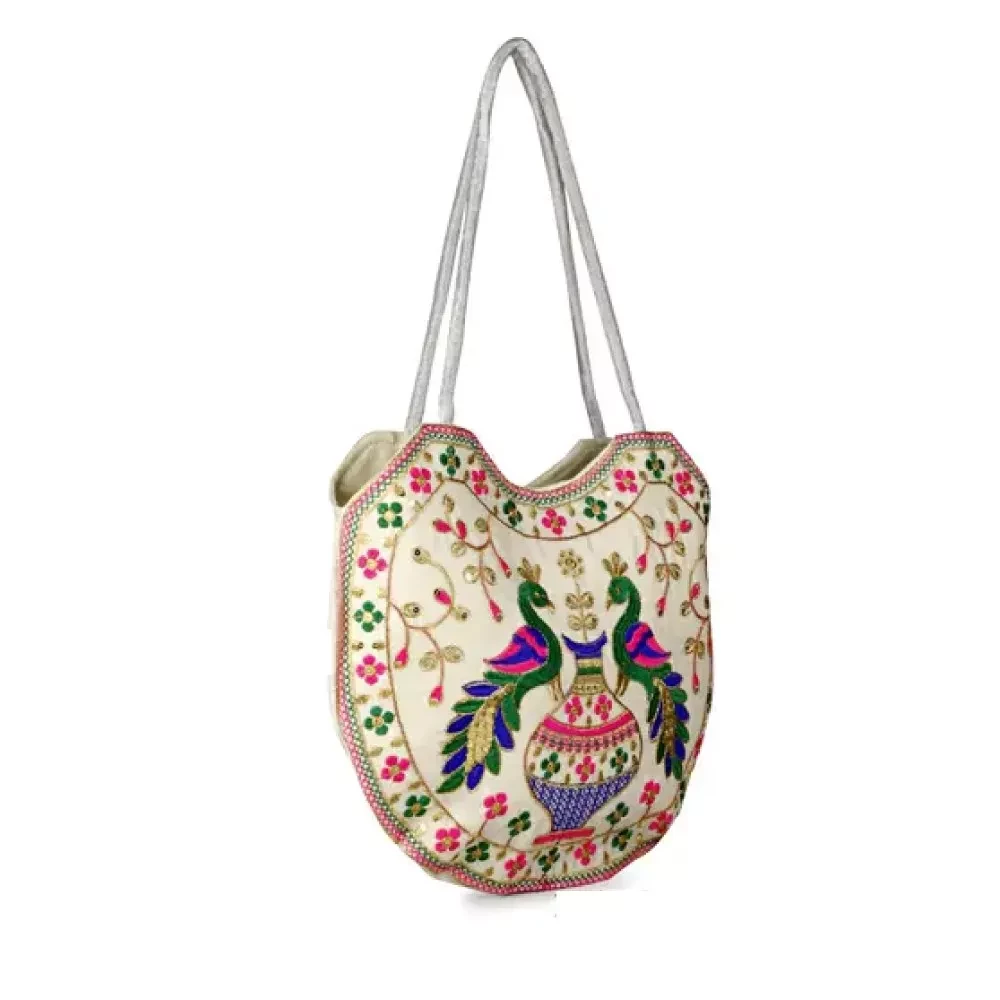 • Traditional Rajasthani Design: Featuring intricate Jaipuri embroidery, this handbag showcases the rich cultural heritage of Rajasthan. The detailed thread work adds a touch of sophistication and elegance.