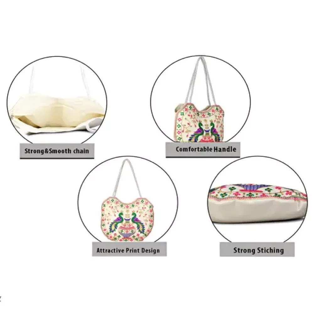 • High-Quality Cotton Fabric: Crafted from premium cotton, this handbag is not only stylish but also durable and comfortable to carry.