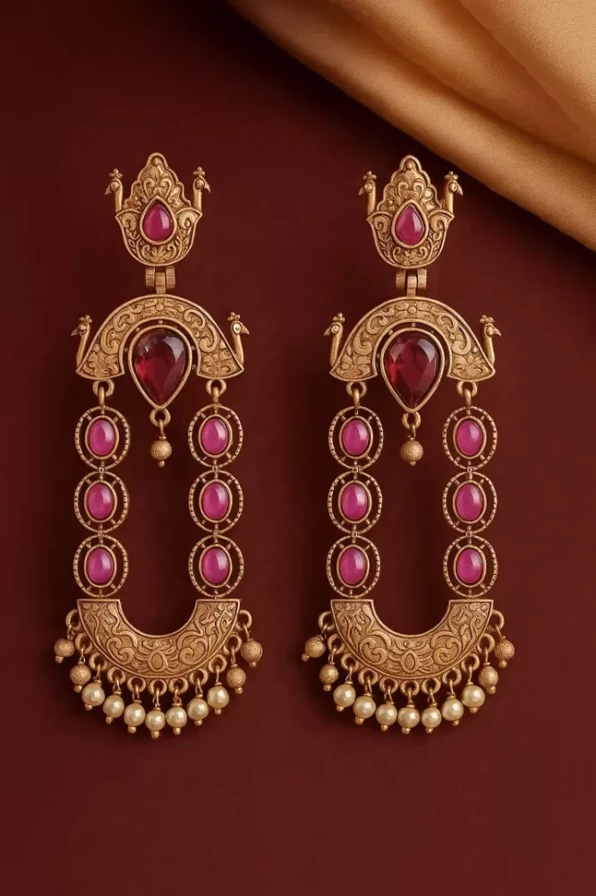 These exquisite gold-toned earrings feature a captivating design adorned with rich maroon stones. Each earring showcases an intricate upper stud with a teardrop maroon stone, leading to a gracefully curved, ornate frame. The frame is embellished with multiple oval-shaped maroon stones set vertically, creating a striking visual appeal. The lower edge of the frame is adorned with delicate gold-toned beads, adding a touch of elegance. The craftsmanship reflects a traditional aesthetic, making these earrings a perfect accessory for festive occasions, weddings, or to add a touch of regal charm to your ensemble. They are designed to dangle gracefully, enhancing the contours of your face.